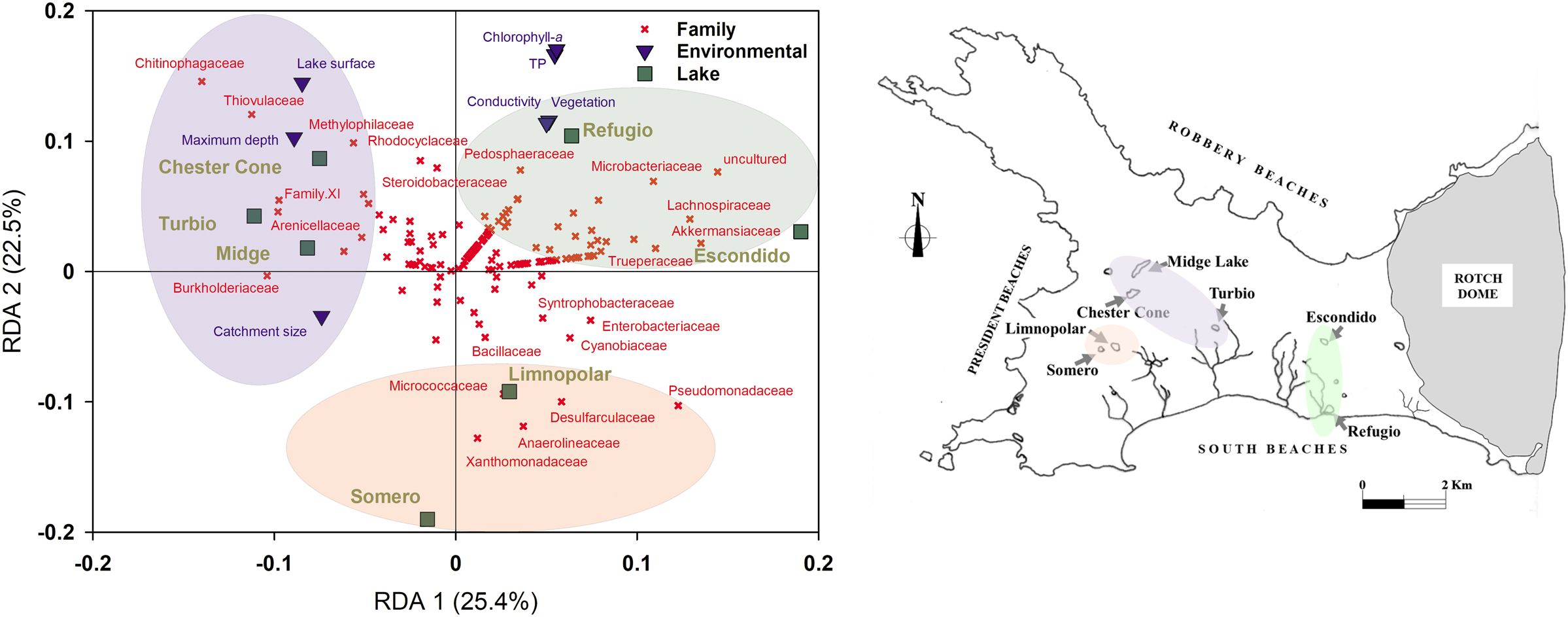 (Left) Redundancy Analysis (RDA) triplot between environmental variables (catchment area, lake surface area, lake depth, percentage of the lake catchment covered by vegetation, water electrical conductivity, TP, and Chl-a) and the bacterioplankton community composition at family level; and (Right) Geographic location of lakes in the Byers Peninsula colored as for the RDA groups.