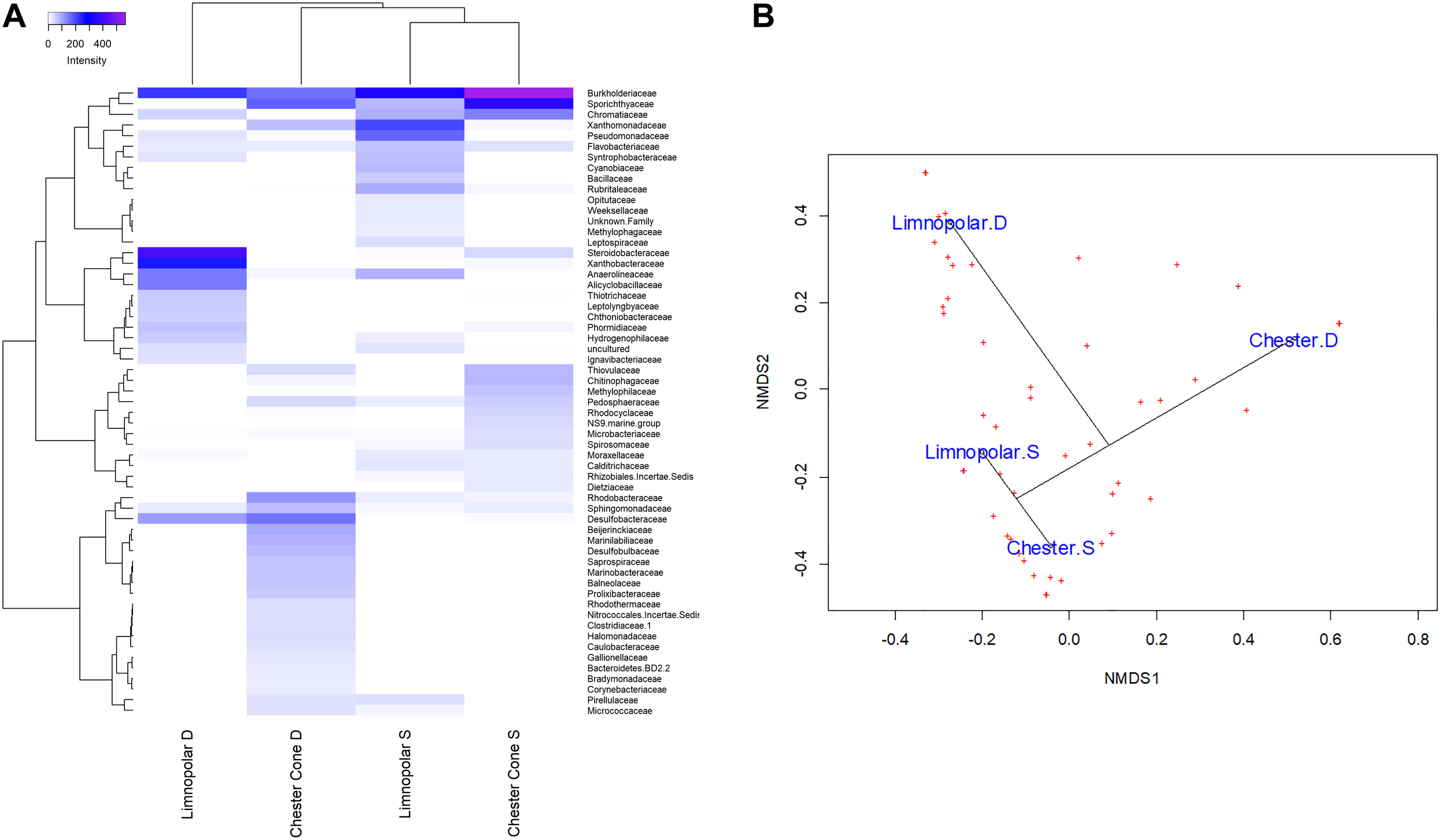 (A) Heatmap of two-way cluster analysis performed on bacterioplankton community composition at family level (families with at least one sample with more than 1% in relative abundance) in the surface and deep water samples of lakes Limnopolar and Chester Cone. Both the taxa and the samples were clustered using Bray–Curtis dissimilarities. The color intensity in the cluster dendrogram correspond to the abundance of normalized reads. (B) A non-metric multidimensional scaling (NMDS) plot based on Bray–Curtis dissimilarity of bacterial taxonomic composition at family level (all families) in the surface and deep water of lakes Limnopolar and Chester Cone.