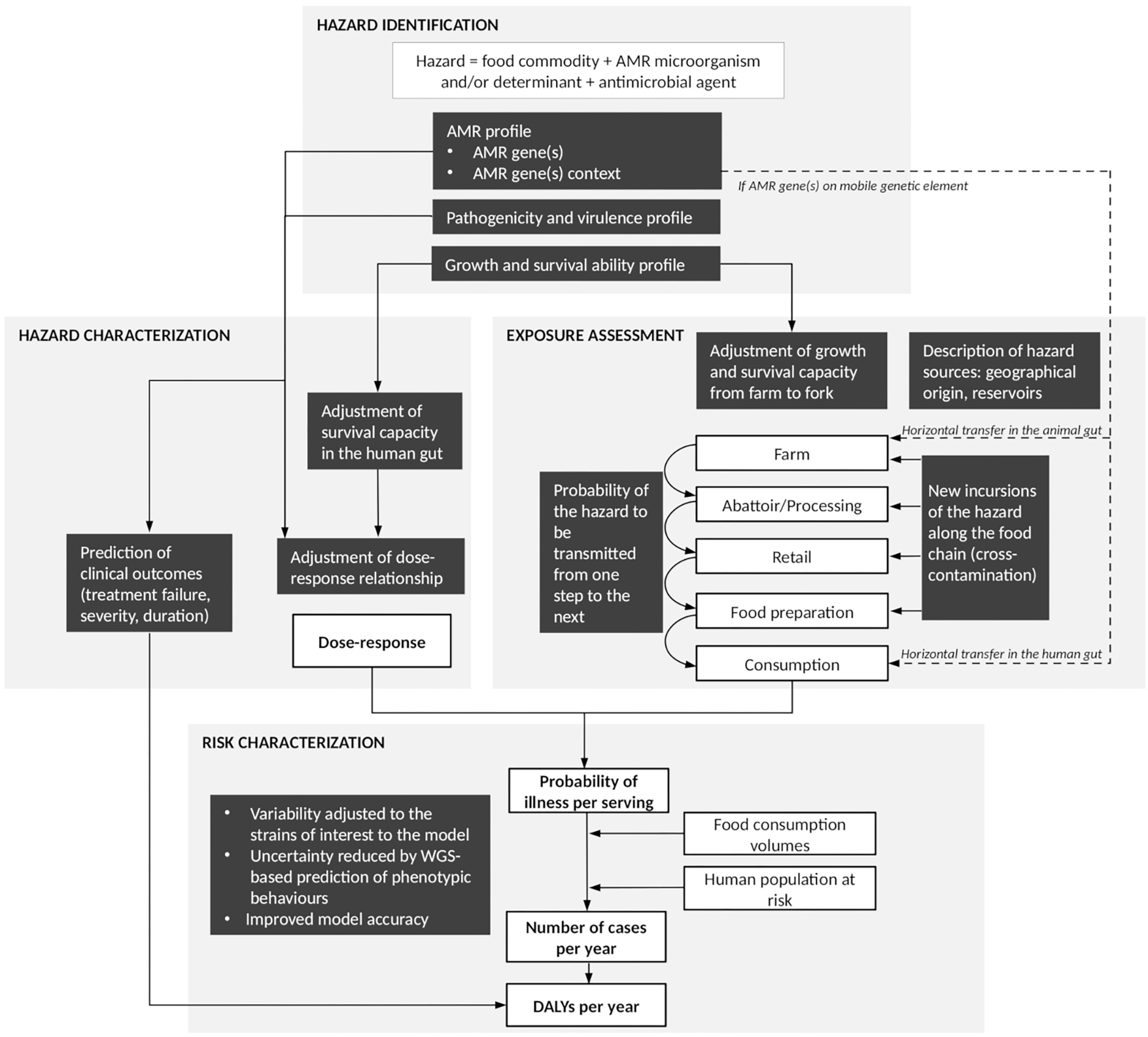 Whole-genome sequencing AMR profiling of a hazard can also be used to adjust the dose–response relationship depending on the occurrence of antimicrobial use in humans (i.e., consumers) prior to ingestion of a contaminated product. This refers to the notion of ‘etiologic fraction’ for prior antimicrobial use, defined by the Institute of Medicine as the proportion of human cases that would not occur but for the resistance of the infecting bacterial strain to the antimicrobial(s) being administered to the patient prior to infection (Institute of Medicine, 1989). Human use of antimicrobials prior to ingestion of an antimicrobial-resistant hazard can increase the probability of infection (or illness) by two means: (i) the selection of hazard strains resistant to the antimicrobial being taken prior to infection for an unrelated reason (selective effect) and (ii) the reduction of competing commensal gastrointestinal flora (competitive effect) (Barza and Travers, 2002). As an example, this approach was used by Otto et al. (2014) to assess the excess of human cases of ceftiofur-resistant S. Heidelberg in Canada attributable to prior antimicrobial consumption in humans (Otto et al., 2014). However, to our knowledge, no literature suggests that the dose–response relationship of an antimicrobial-resistant hazard would differ from a non-resistant hazard in the absence of antimicrobial treatment (assuming they have similar pathogenicity profiles). The adjustment of the dose–response relationship would therefore only be needed in case of prior antimicrobial use in the human patient, unless WGS reveals an association between AMR and pathogenicity (Figure 2).