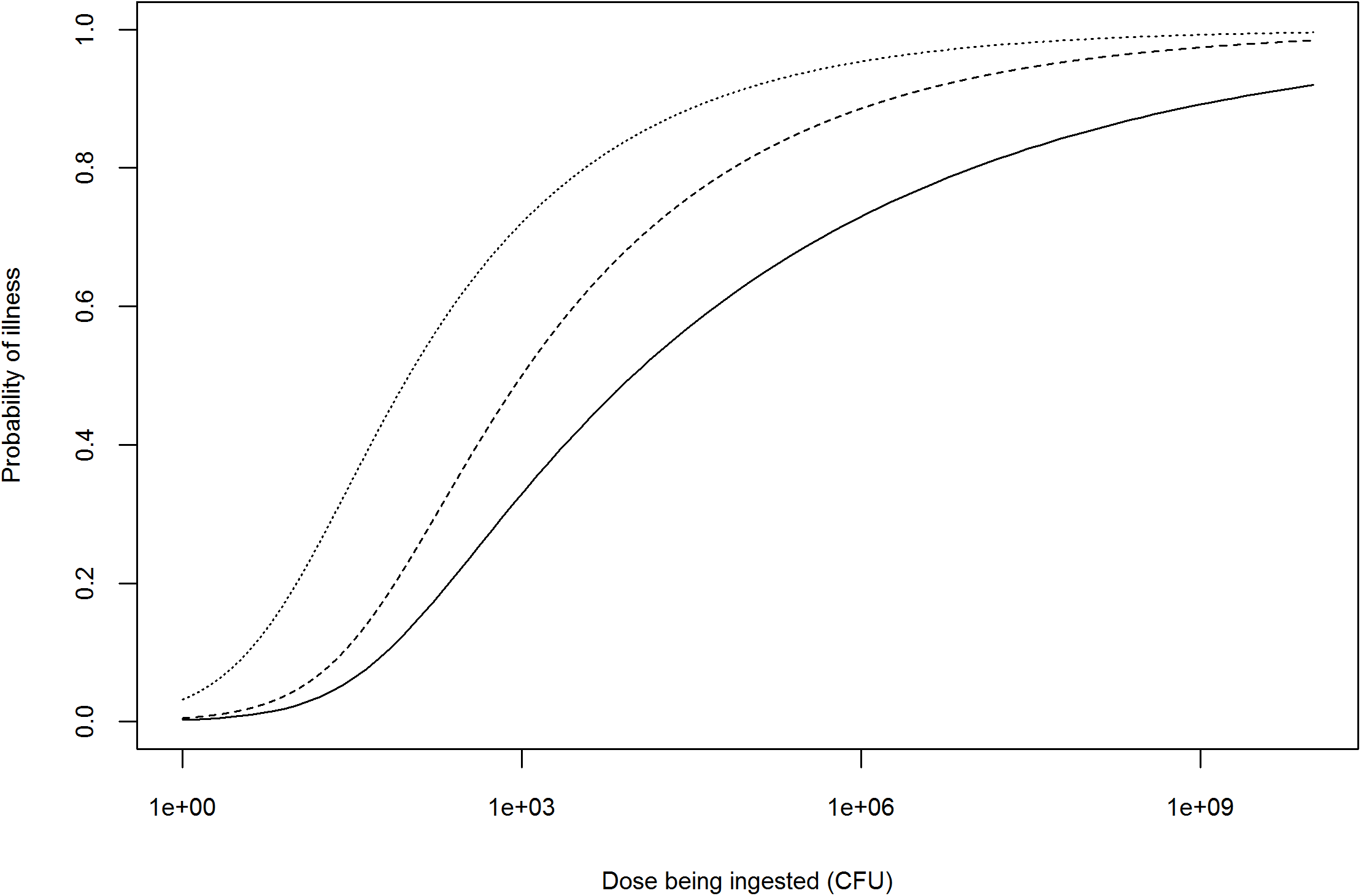Figure 2. Illustration of possible adjustments to the dose–response relationship of an antimicrobial-resistant Salmonella spp. strain based on information provided by WGS profiling. Solid line represents the dose–response curve of a generic Salmonella spp. (FAO/WHO, 2002); dashed line: dose–response after theoretical adjustment for high pathogenicity; dotted line: dose–response after theoretical adjustment for high pathogenicity and prior antimicrobial use in human patient.