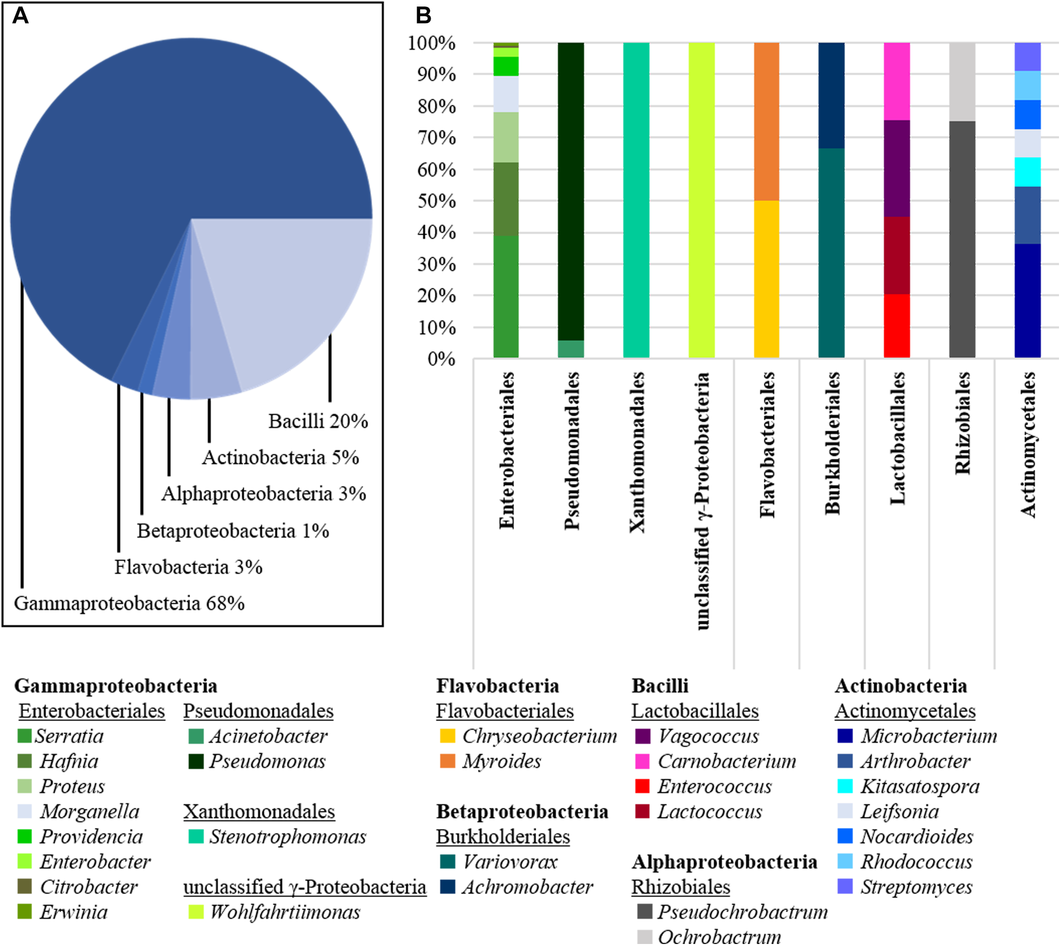 Diversity of cultivated bacteria isolated from dissected beetle guts. (A) The class of Gammaproteobacteria is the most abundant one isolated with 68% of all cultures obtained, followed by Bacilli (20%) and Actinobacteria (5%). Further, also Flavobacteria (3%), Alphaproteo- (3%), and Betaproteobacteria (1%) were cultivated. (B) The class of Gammaproteobacteria is represented by the orders of Enterobacteriales, Pseudomonadales, Xanthomonadales and a single unclassified genus (Wohlfartiimonas). Enterobacteriales was the order with the highest species diversity isolated. The second prominent phylum of Bacilli was represented by only four genera of the order Lactobacillales. The phylum Actinobacteria was represented by the order of Actinomycetales. Compared to the number of isolates, the species diversity within this order was surprisingly high, although other more abundant phyla appeared to be much less diverse.