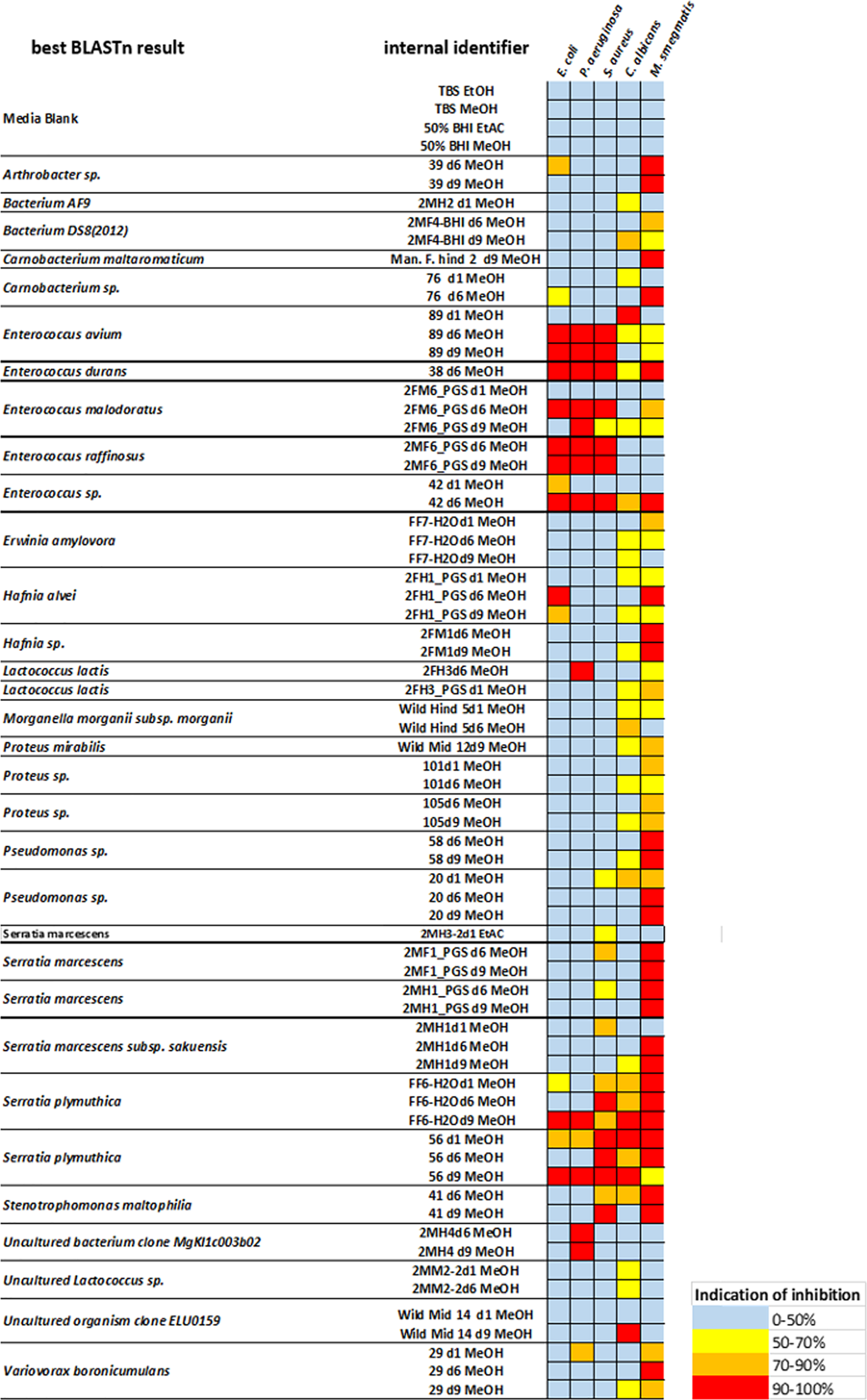 Antimicrobial activity of selected N. vespilloides gut bacteria against five representative bacterial pathogens. The color key indicates the percentage of growth inhibition of Escherichia coli ATCC 25922, Pseudomonas aeruginosa ATCC 27853, Staphylococcus aureus ATCC 25923, and Candida albicans. Single inhibition effects of Mycobacterium smegmatis are not displayed here because of the high amount of positive results. Column 1 displays the best BLAST result of the 16S analysis, column 2 contains the internal strain names, including the duration of fermentation (e.g., d6 = 6 days of fermentation) and the solvent used for extraction. On the right side, a heat map displays the range of antimicrobial effects observed.