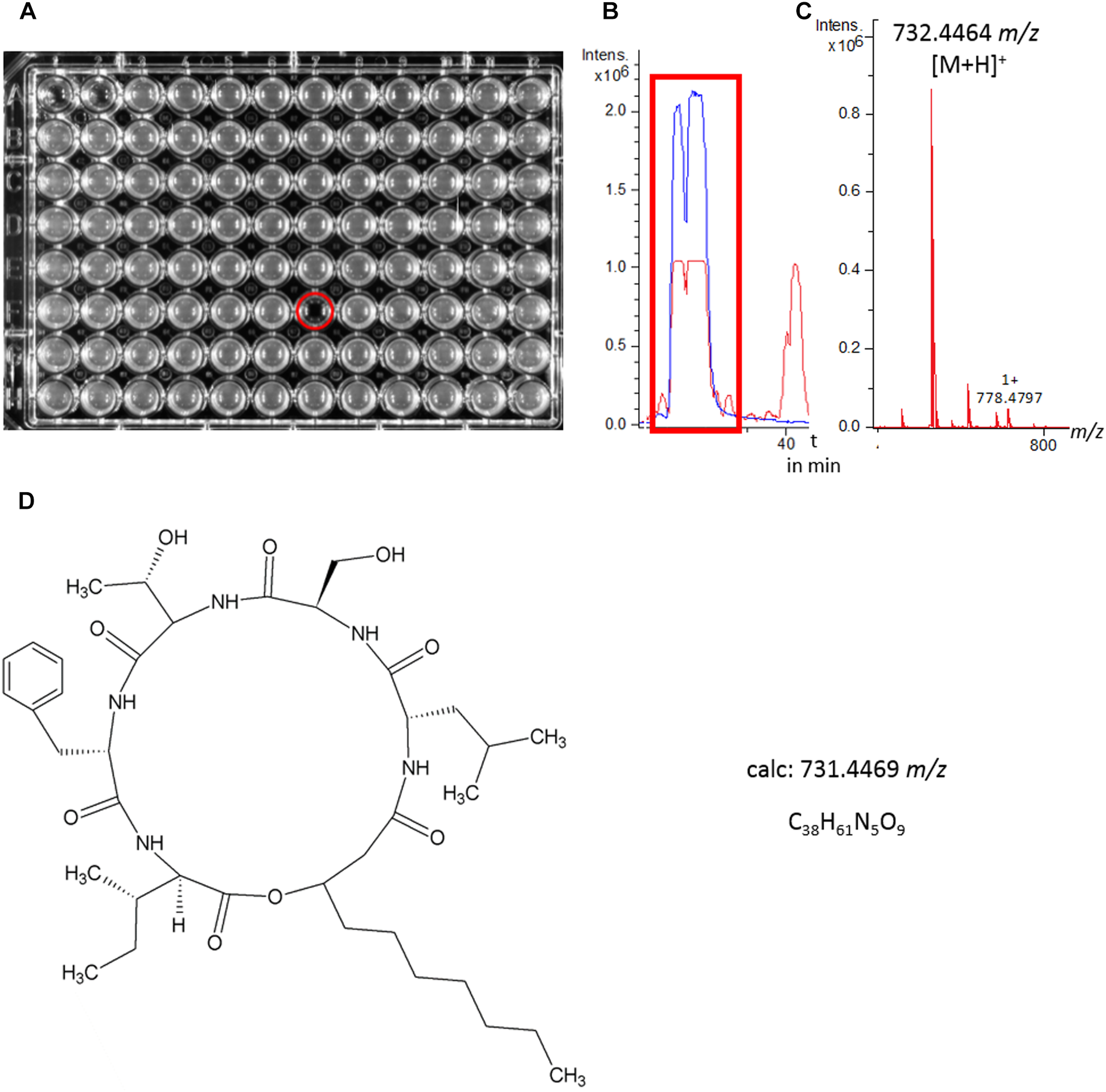 Identification of serrawettin W2. (A) HPLC fraction collection and biological tests for antimicrobial activity against Staphylococcus aureus resulted in the identification of a single active fraction. (B,C) LC-MS analysis revealed a major peak in the base peak chromatogram (red line) of the crude extract as the active fraction, m/z = 732.4464 [M+H]+. The extracted ion chromatogram (blue line) m/z 732.43–732.46 highlights the peak segment with antimicrobial activity. (D) Structure of serrawettin W2 (C38H61N5O9), a cyclodepsipeptide with known antimicrobial activity and a m/z of 731.4469 [M]+.