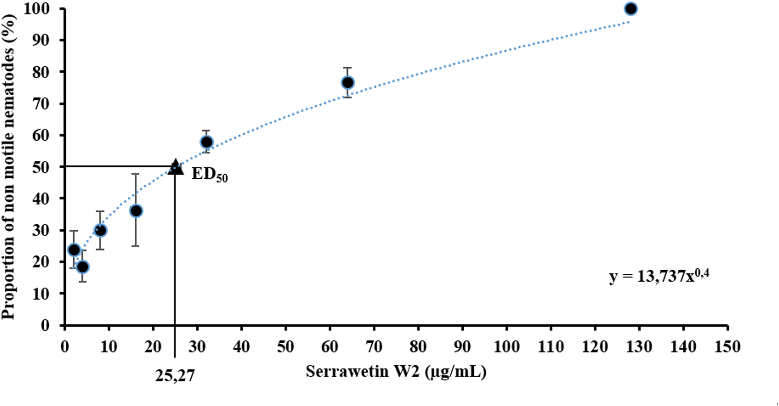 Nematode motility assay with serrawetin W2. Non-motile nematodes were counted under the microscope, and the abundance of non-motile nematodes was calculated. By displaying the experimental data (average and standard error), a resulting effective dose (ED50) was extrapolated.