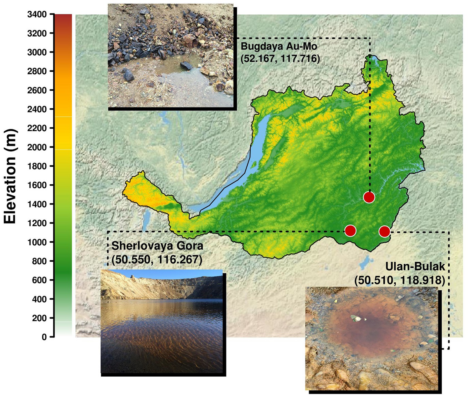 Localisation of sampling sites in Transbaikalia (the area to the east from the lake Baikal): Acidic pit lake (site Sherlovaya Gora), Acidic drainage water from Bugdaya Au-Mo (W) deposit and Natural acidic spring Ulan-Bulak.