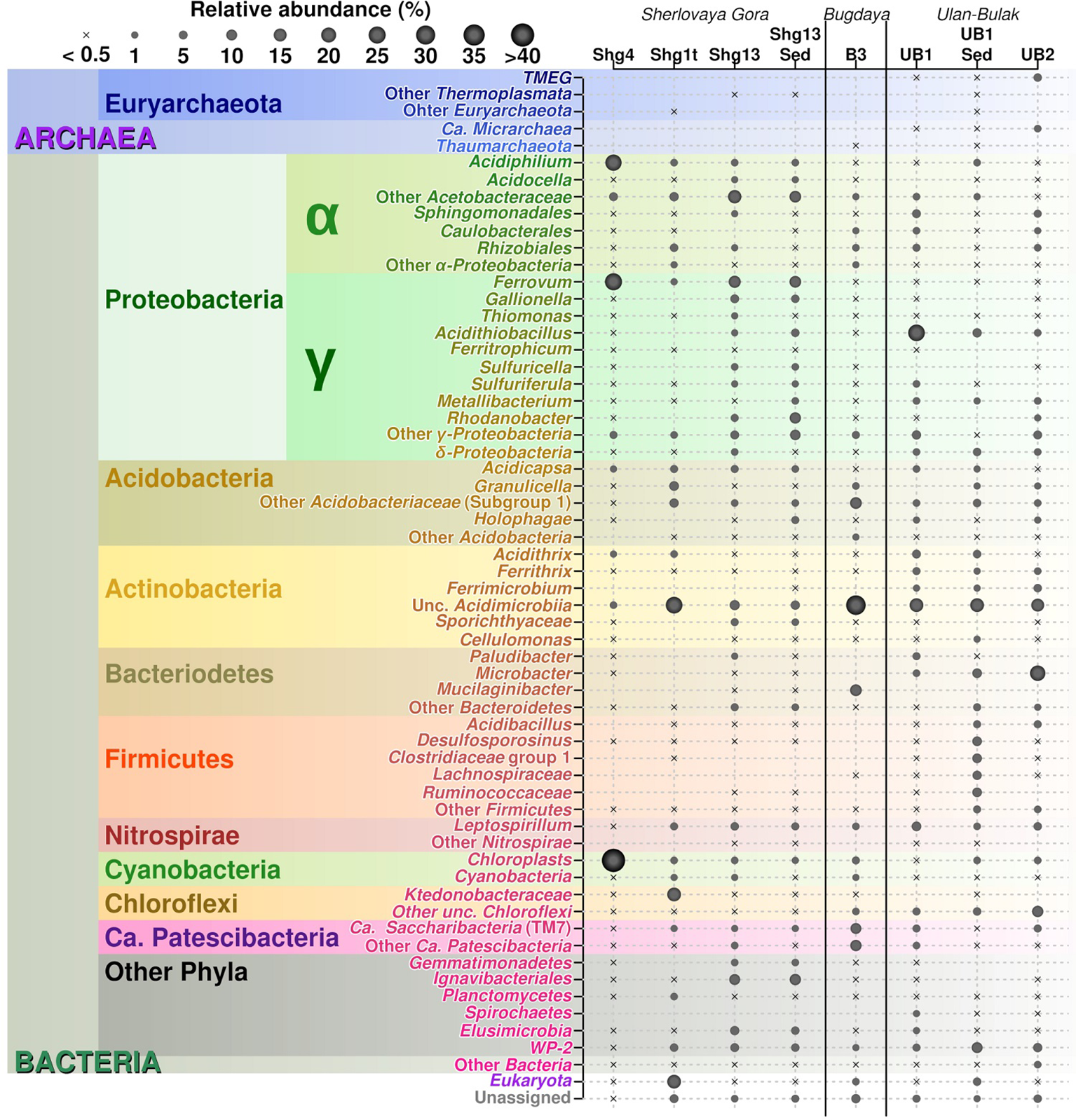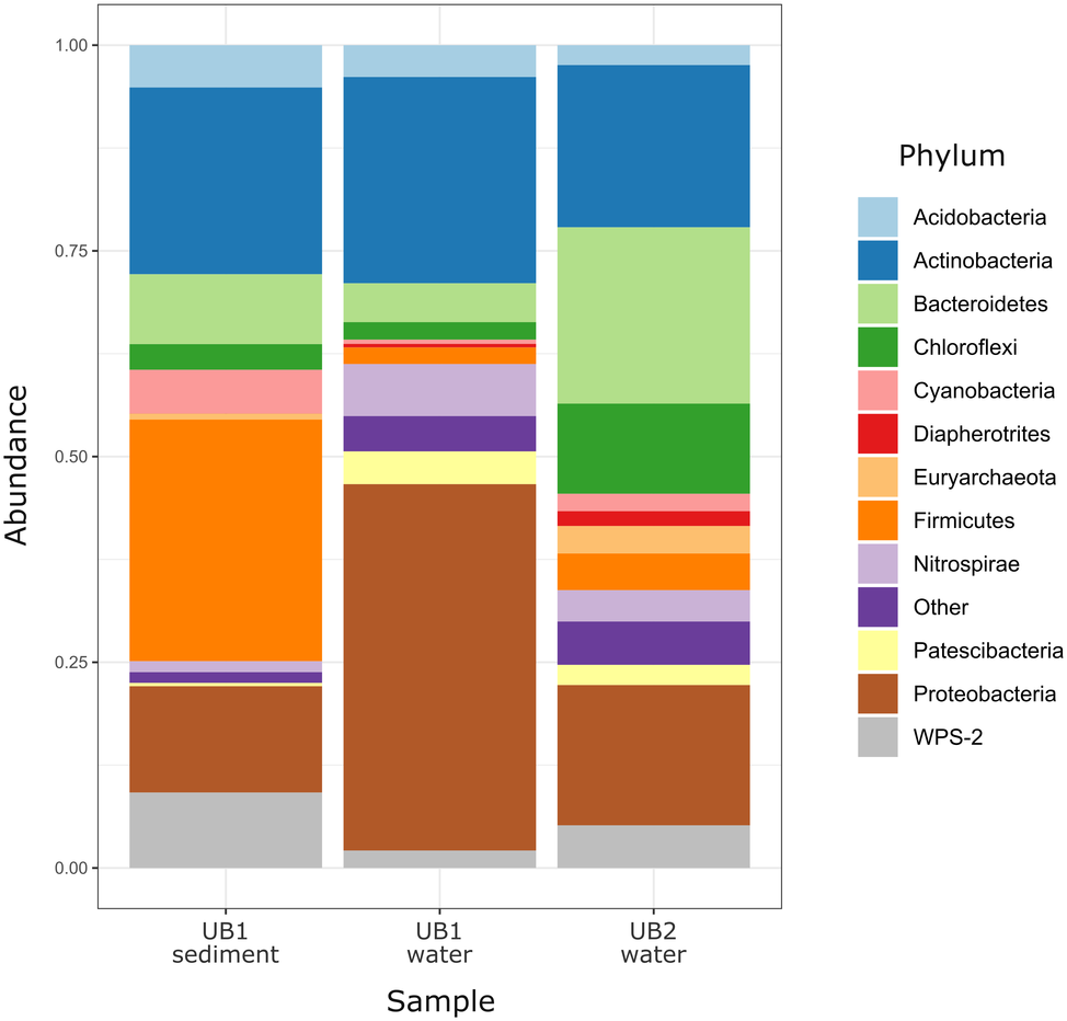 The 16S rRNA gene amplicon sequencing data showed minor archaeal (less than 0.5%), but mainly bacterial signatures in all studied sampling points of Opencast Pit Lake on the deposit Sherlovaya Gora.