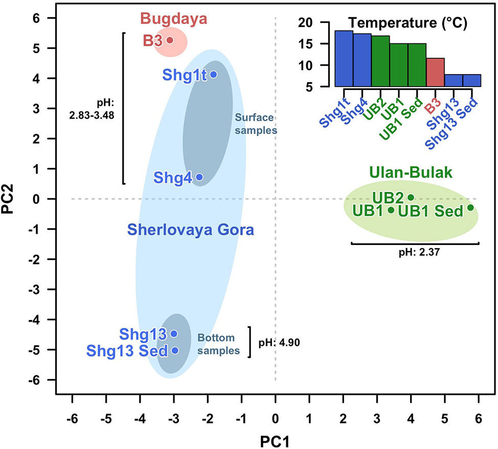 Altogether, the analysis of Ulan Bulak samples indicates that the main components of microbial population in this natural acidic environment are organisms involved in redox transformations of iron, which soluble forms are highly available in the system, and organotrophic organisms degrading complex organic matter entrapped into iron-rich sediments. Comparison of community composition in two sites of Ulan-Bulak with different content of plant residues revealed influence of these organic sources on the distribution of typical acidophiles and novel uncultured groups in this natural acidic environment. A potential for anaerobic acidophilic Firmicutes and Bacteroidetes as well as for uncultured Acidimicrobiia to play a significant role in the community can also be recognized. Principal components analysis (Figure 5) revealed clustering of samples by pH values and temperatures of the sites. Diversity of surface water samples from Sherlovaya Gora pit lake appeared to be more close to that of surface water bodies of Ulan-Bulak and Bugdaya sites than to the bottom samples of the lake, while pH parameter separates all of the samples into three groups, including surface water samples from Sherlovaya Gora and Bugdaya sites, water and sedimentary samples from Ulan-Bulak and bottom water and sediment samples from Sherlovaya Gora pit lake with significantly higher pH values of ca. 5 in contrast to 2.4–3.5 in other sites. Rarefaction analysis across all sampled sites (Supplementary Figure S1) showed that B3 and UB1 are likely to host the most diverse communities spots unlike the Shg4 (microbial mat grown on plant remnants) exhibiting the lowest microbial diversity.