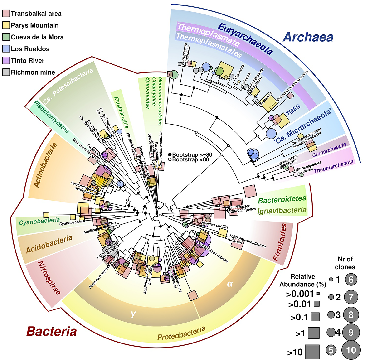 Phylogenetic tree of prokaryotic diversity found in different acidic sites. Sequences belonging to the 16S rRNA gene used in the tree have been obtained from isolated clones (represented in circles) or as reads from barcodes sequencing (squares). Size of circles is related to number of clones of the same taxonomic group found in the site, whereas squares size are related to relative abundance of reads. Labeled branches correspond to reference sequences chosen from each phylum. The tree combines data from different acidic mine drainages (AMDs; Transbailkal area, Parys Mountain and Richmond mine and pit lakes of Transbaikal area, Tinto River and Cueva de la Mora). Sequences have been aligned using Mafft (Katoh and Standley, 2013). Resulting multiple alignment was trimmed using Trimal (Capella-Gutierrez et al., 2009), removing those columns with more than 50% of gaps or similarity score lower than 0.0001. Phylogenetic tree was calculated by maximum likelihood with bootstrapping of 1,000 replicates. Graphical development was performed under R programming environment using basic tools and the package ape (Paradis and Schliep, 2018).