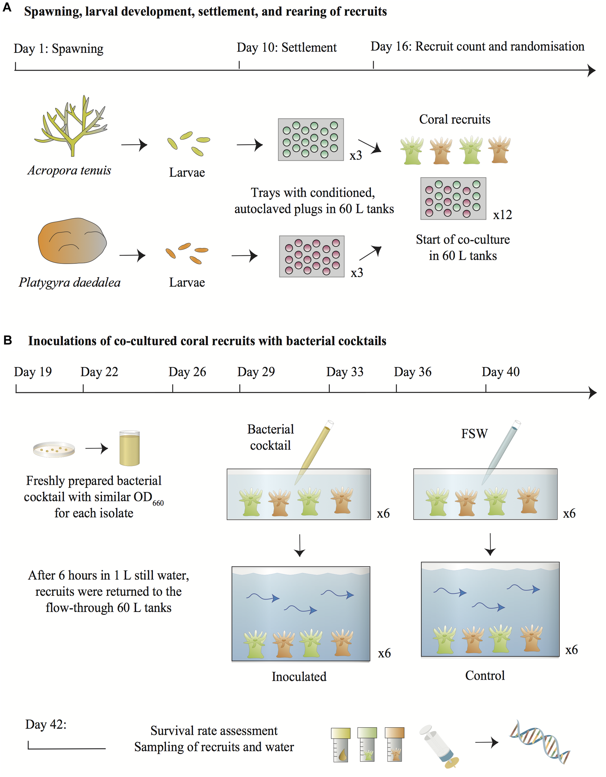 Figure 1. Overview of the experimental design. (A) Larvae from A. tenuis and P. daedalea were independently settled on plugs pre-conditioned with a microbial biofilm and CCA and subsequently sterilized. Six days post-settlement, recruits were counted and randomized across twelve 60 L tanks containing flow-through FSW. (B) On each inoculation day, bacterial pure cultures grown on MA from the frozen stocks were suspended in FSW and adjusted to similar densities in order to prepare a fresh bacterial cocktail. Recruits from each 60 L tank were placed in containers filled with 1 L of static FSW. The bacterial cocktail was added to six containers using a serological pipette to inject 10 mL of the suspension into the water directly above the recruits. The bacterial density in the inoculated containers was estimated at 105–106 cells/mL. Recruits from the control treatments were handled in the same manner, except that FSW was added to the containers instead of the bacterial cocktail. After 6 h in static water, recruits were transferred back into the 60 L flow-through tanks. Two days following the last inoculation, all recruits were counted, sampled from the 60 L tanks together with 1 L of surrounding water and snap-frozen for DNA extraction and 16S rRNA gene metabarcoding. Symbols for diagrams were modified from the Courtesy of Integration and Application Network (2018).