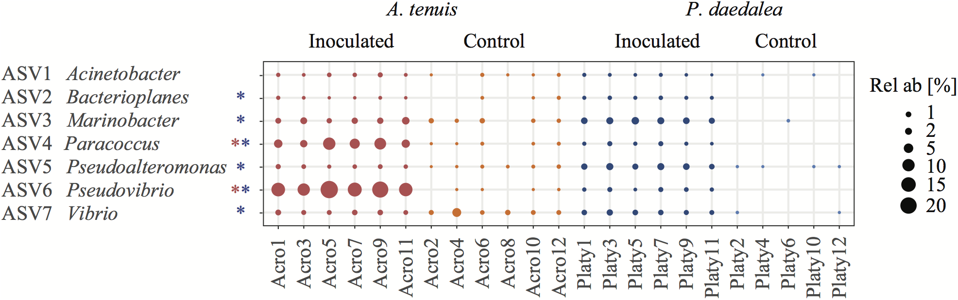 Figure 5. Bubble plot representing the relative abundance within each sample of the seven bacterial ASVs used for inoculation (i.e., having a 100% sequence identity to the present in the inocula). The asterisks next to the bacterial names indicate that this ASV had a significantly different LFC in abundance between control and inoculated recruits. Coral samples were collected at the end of the experiment (day 42) following the seven bacterial inoculations. Red refers to A. tenuis while blue refers to P. daedalea. Rel ab, relative abundance.
