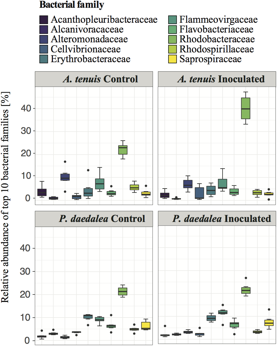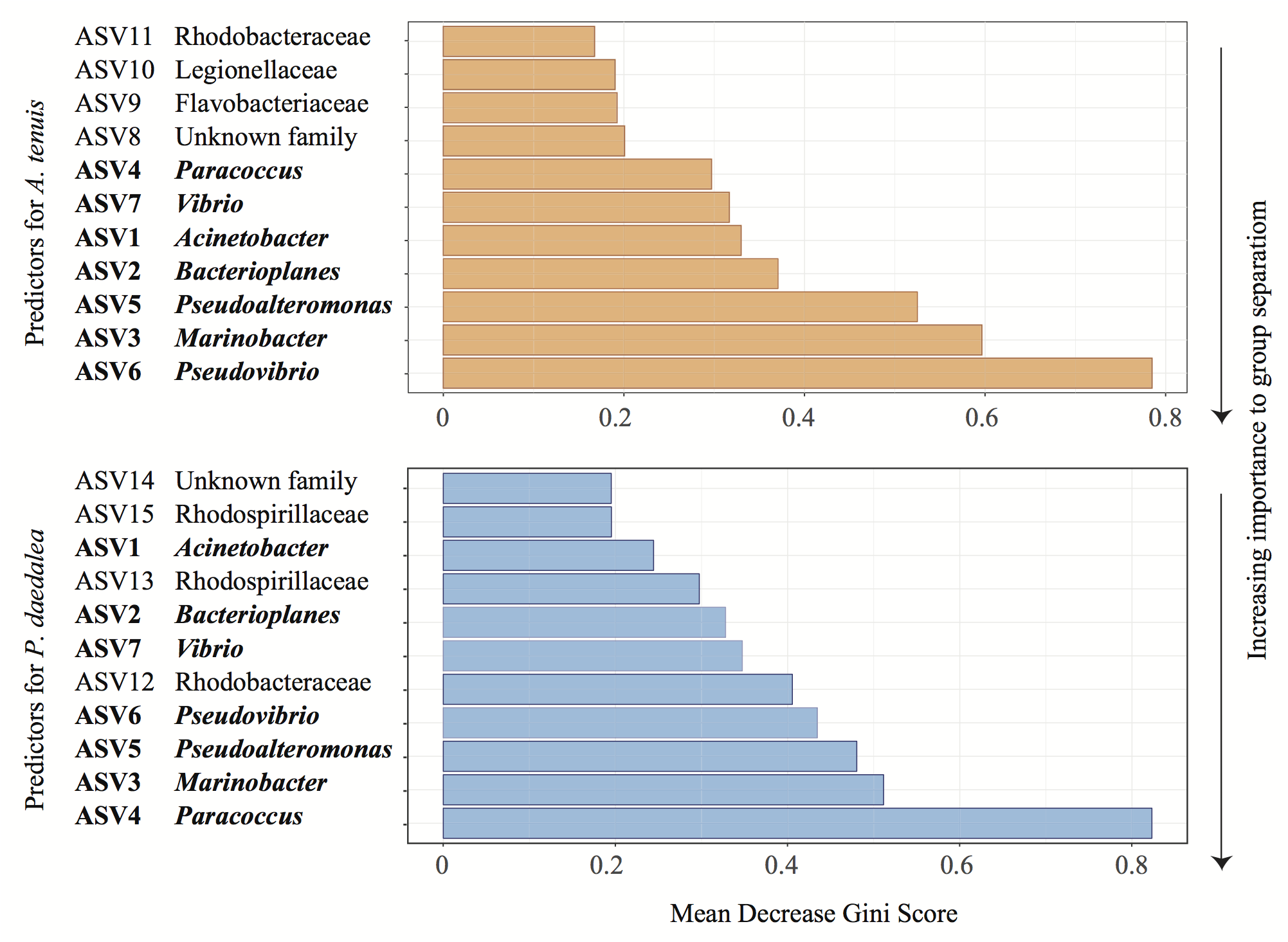Figure 6. Representative output of the random Forest classification with 100 iterations to identify the most important predictor ASVs in A. tenuis (orange) and P. daedalea (blue). The genus or family (when known) of each ASV is specified. Names written in bold represent the inoculated ASVs.