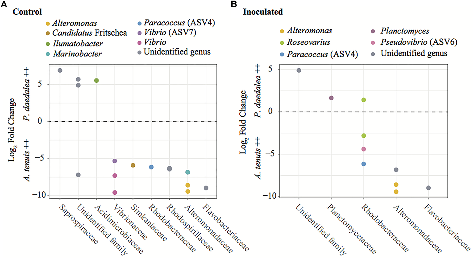 Figure 8. Results from the differential abundance analysis with significance level α = 0.01, expressed as Log2 Fold Change for the comparison between A. tenuis and P. daedalea recruits within each treatment: (A) control recruits and (B) inoculated recruits. Each dot represents one ASV (including ASVs 4, 6, and 7 from the inocula), here identified at the genus level when possible. Positive values represent ASVs proportionally more abundant in P. daedalea, while negative values are ASVs proportionally more abundant in A. tenuis.