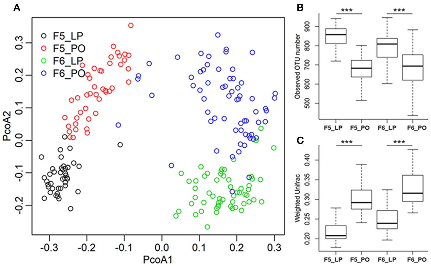 Remodeling of gut microbial composition in sows from later pregnancy to postpartum state. (A) PCoA analysis shows the different gut microbial compositions between sows at later pregnancy (LP) and postpartum (PO) state in both F5 and F6 sows. (B,C) Indicate the changes of gut microbial diversity from LP to PO state. (B) Observed species; (C) within-group weighted UniFrac distance (β-diversity). The X-axis shows the sample groups, and the Y-axis indicates observed species or the value of within-group weighted UniFrac distance. ***Represents the significance threshold of P < 0.005.