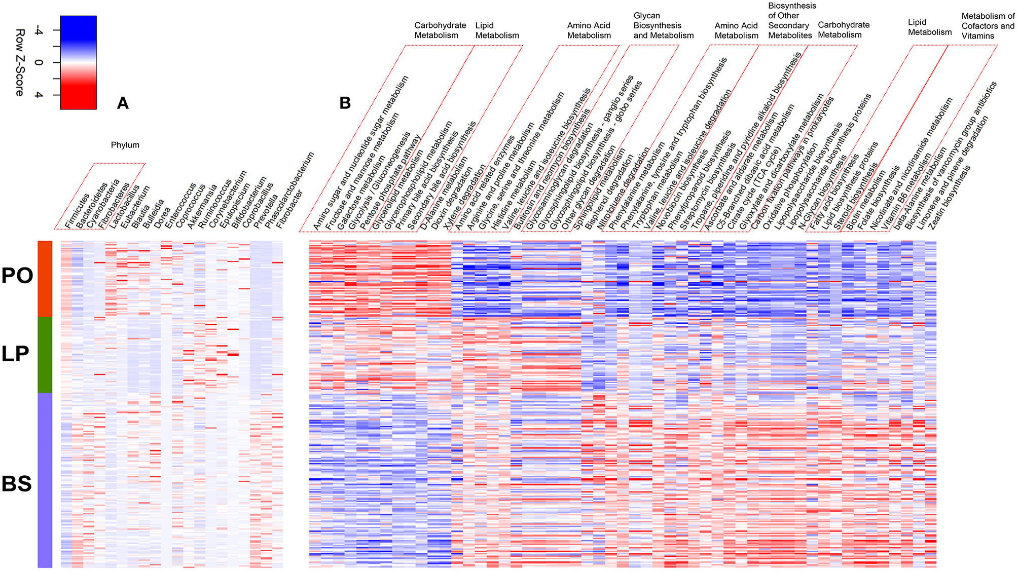 Heatmap of the significant shifts of gut microbial taxa and predicted KEGG pathways from non-pregnancy, later pregnancy to postpartum state. (A) The bacterial taxa significantly shifted from non-pregnancy (BS), later pregnancy (LP) to postpartum (PO) state. (B) The KEGG pathways showing different abundances from BS, LP to PO state.