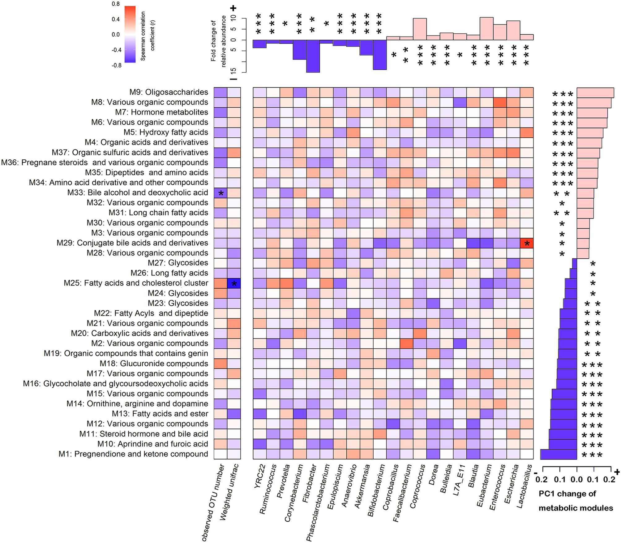 Association between the shifts of gut microbiome and the changes of serum metabolite modules from later pregnancy (LP) to postpartum (PO) state. The bar plot above the heatmap shows the fold change of the relative abundances of microbial taxa. The bar plot on the right side of the heatmap shows the PC1 shifts of metabolic modules. The blue bars represent the enrichment at the LP state, and the pink bars indicate the enrichment at the PO state. The star number indicates the significant threshold *FDR < 0.05, **FDR < 0.01, and ***FDR < 0.001. The different colors of grids show the spearman correlation coefficiency between the changes of microbial taxa and the shifts of host serum metabolome. The stars in the grids indicate the significance.