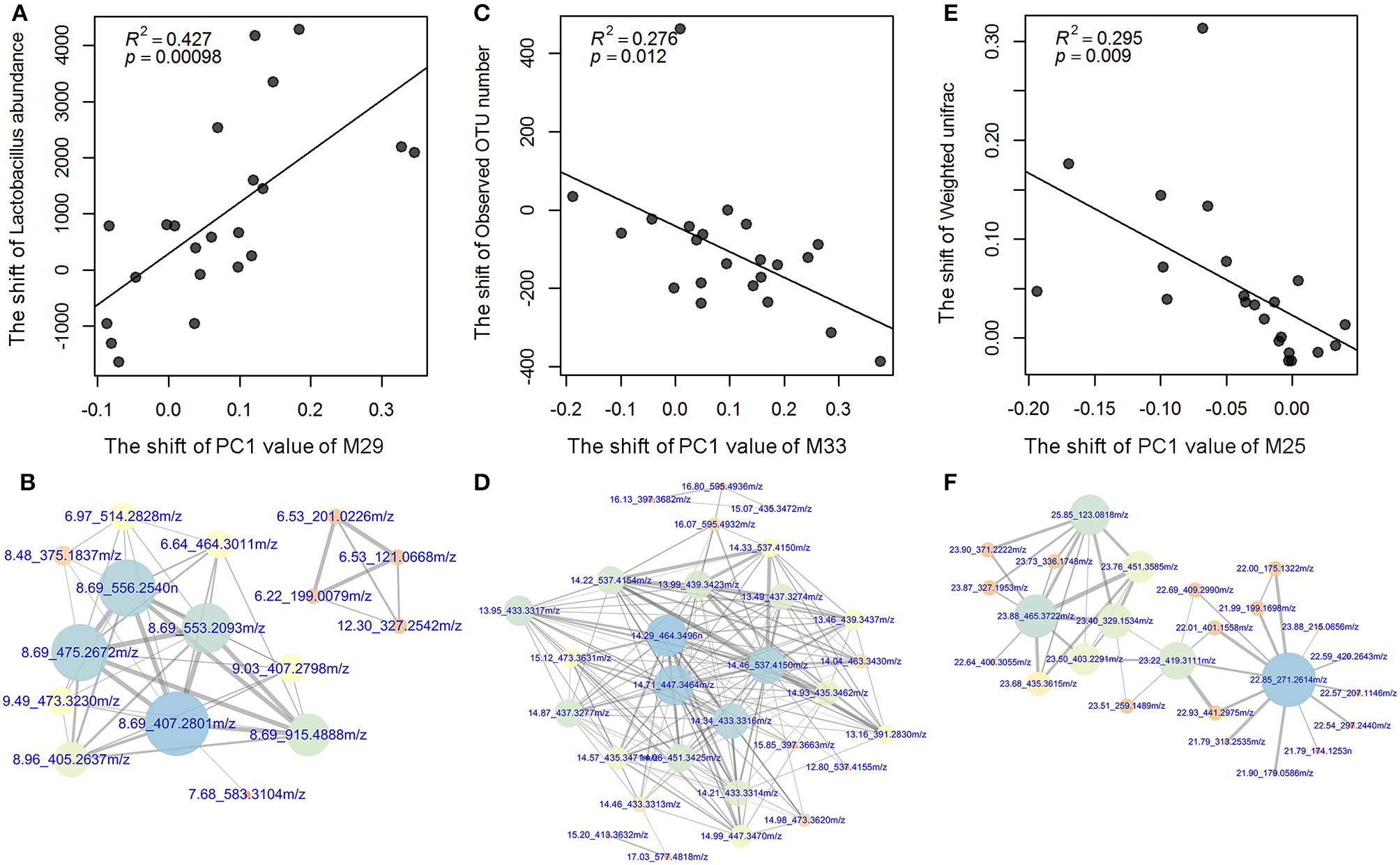 The significant associations between the shifts of Lactobacillus abundances and bacterial diversity, and the changes of metabolic modules. (A) The shift of the abundance of Lactobacillus (the number of read sequences) was positively associated with the change of metabolic module 29 (M29) which was related to bile acid biosynthesis (B). (C) The shift of the observed OTU number was negatively associated with the change of metabolic module 33 (M33) which was related to bile acid metabolism (D). (E) The shift of the β-diversity of gut microbiota (weighted UniFrac distance) was negatively associated with the change of metabolic module 25 (M25) which was related to lipid metabolism (F). The X-axis shows the changed values of host metabolic modules, and the Y-axis indicates the changed values of gut microbiota. The size and color of dots indicate the degree of connectivity of hubs, and the thickness of lines shows the strength of correlations. The annotations of metabolite features (m/z) are listed in Table S5.