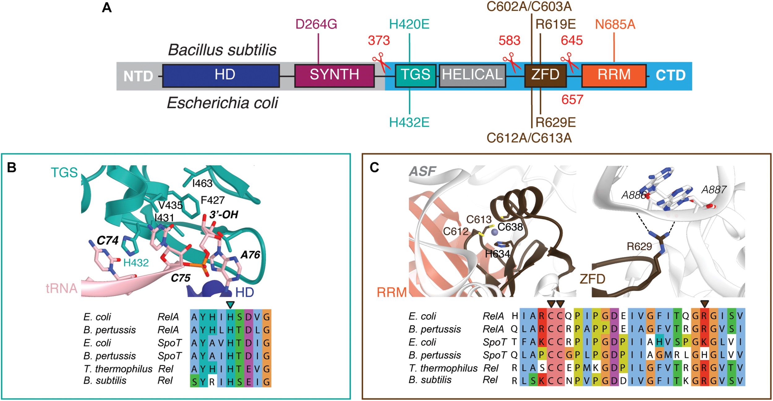 Long RSHs are universally comprised of two functional regions: the catalytic N-terminal domains (NTD) and the regulatory C-terminal domains (CTD) (Figure 1A) (Atkinson et al., 2011). The NTD region comprises the (p)ppGpp hydrolase domain (HD; enzymatically inactive in RelA) and the (p)ppGpp synthetase domain (SYNTH) linked by an α-helical region that regulates the allosteric crosstalk between both domains (Tamman et al., 2019). The CTD encompasses four domains: the Thr-tRNA synthetase, GTPase and SpoT domain (TGS), the Helical domain, the Zing Finger Domain (ZFD) [equivalent to Ribosome-InterSubunit domain, RIS, as per (Loveland et al., 2016), or Conserved Cysteine, CC, as per (Atkinson et al., 2011)], and, finally, the RNA Recognition Motif domain (RRM) [equivalent to Aspartokinase, Chorismate mutase and TyrA, ACT, as per (Atkinson et al., 2011)]. When Rel/RelA is bound to a starved ribosomal complex, the TGS domain inspects the deacylated tRNA in the A-site and the TGS domain interacts directly with the 3′ CCA end of the A-site tRNA (Arenz et al., 2016; Brown et al., 2016; Loveland et al., 2016). The conserved histidine 432 residue of E. coli RelA mediating this interaction is crucial for activation of RelA’s enzymatic activity by the 3′ CCA (Winther et al., 2018). Both ZFD and RRM interact with the A-site finger (ASF) of the 23S ribosomal RNA (Arenz et al., 2016; Brown et al., 2016; Loveland et al., 2016), and in E. coli RelA this contact is crucial for efficient recruitment to and activation by starved ribosomal complexes (Kudrin et al., 2018).