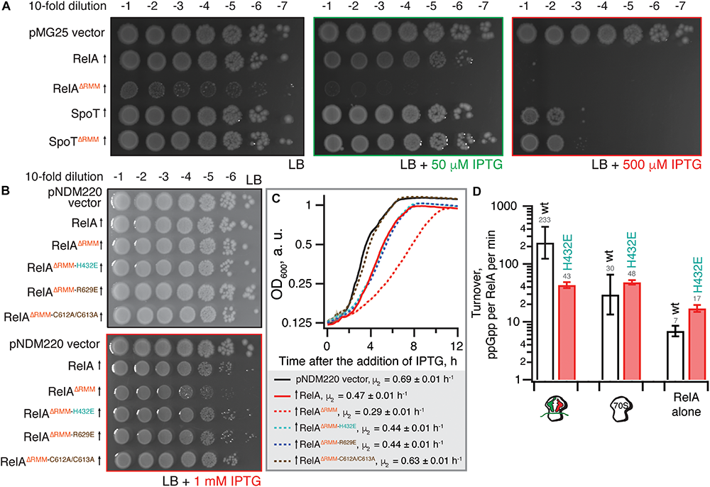 Figure 2. The toxicity of ΔRRM E. coli RelA is mitigated by mutations compromising interactions with tRNA and the ribosome. (A) Wild-type E. coli BW25113 cells were transformed with either the empty high-copy IPTG-inducible pMG25 plasmid vector or pMG25-based constructs expressing wild-type and ΔRRM versions of E. coli RelA and SpoT. Up-pointing arrows indicate induction of expression. Ten-fold serial dilutions of overnight LB cultures were made and spotted onto LB agar supplemented with 100 μg/mL ampicillin and either 0, 50, or 500 μM IPTG. The plates were incubated at 37°C and scored after 18 h. (B) E. coli BW25113 cells were transformed either with the empty low-copy IPTG-inducible pNDM220 vector or pNDM220-based constructs expressing wild-type and mutant versions of E. coli RelA as indicated on the figure. Ten-fold serial dilutions of overnight LB cultures were made and spotted onto LB agar supplemented with 30 μg/mL ampicillin and 1 mM IPTG. As a plating control the same dilutions of the overnight cultures were spotted on LB agar supplemented with 30 μg/mL ampicillin but no IPTG. The plates were incubated at 37°C and scored after 18 h. (C) Thousand-fold dilutions of the same overnights were made in LB supplemented with 30 μg/mL ampicillin and 1 mM IPTG, and growth at 37°C was monitored using the Bioscreen C growth curve analysis system. The growth rates (μ2) were calculated from three independent measurements and the error bars represent standard errors. (D) H432E TGS E. coli RelA is not activated by deacylated tRNA on the ribosome. The synthetase activity of 30 nM wild type and H432E E. coli RelA was assayed in the presence of 1 mM ATP, 300 μM 3H GDP and 100 μM ppGpp in HEPES:Polymix buffer, pH 7.5, 37°C, 5 mM Mg2+. As indicated on the figure, the reaction mixture was supplemented either with 2 μM vacant 70S ribosomes or with an in situ assembled starved ribosomal complex (2 μM vacant 70S combined with 2 μM mRNA(MV), 2 μM E. coli tRNAifMet and 2 μM E. coli tRNAVal). The error bars represent standard deviations of the turnover estimates by linear regression using four data points.