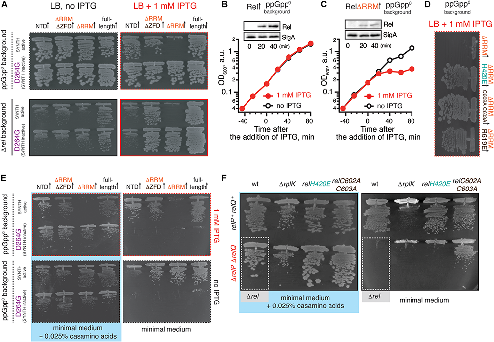 Figure 3. Deletion of the regulatory RRM domain leads to B. subtilis Rel toxicity due to ribosome-dependent (p)ppGpp overproduction. (A) Full-length (VHB155 and VHB183) as well as C-terminally truncated Rel variants [synthesis-competent ΔRRM (VHB159 and VHB184), ΔRRMΔZFD (VHB160 and VHB185) and RelNTD (VHB161 and VHB186), and the corresponding synthesis-inactive D264G mutants VHB162-164; VHB187-190] were expressed in either ppGpp0 (upper row; test for toxicity mediated by (p)ppGpp accumulation) or Δrel (lower row; test for HD functionality) B. subtilis growing on solid LB medium. Up-pointing arrows (↑) indicate ectopic expression. (B,C) Expression of RelΔRRM causes a growth defect in liquid culture. Either wild-type rel (VHB183) (B) or relΔRRM mutant (VHB184) (C) were expressed in ppGpp0 background grown in liquid LB medium at 37°C. Protein expression was induced by IPTG added to final concentration of 1 mM to exponentially growing bacterial cultures at OD600 0.2. Protein expression was monitored by Western blotting using anti-Rel antibodies (see also Supplementary Figure S2H). (D) The toxicity of mutant versions of RelΔRRM tested in ppGpp0 B. subtilis growing on solid LB medium: wild type RelΔRRM (VHB184), H420E (VHB231) defective in recognition of the tRNA 3’ CCA end, and ZFD mutants C602A C603A (VHB233) and R619E (VHB281) defective in 70S binding. LB plates were scored after 18 h incubation at 37°C. (E) C-terminally truncated Rel variants (either synthesis-competent (VHB155, VHB159-161) or synthesis-inactive D264G mutant versions (VHB156, VHB162-164) were expressed in ppGpp0 B. subtilis growing on either solid minimal medium or solid minimal medium supplemented with 0.025% casamino acids. Plates were scored after 36 h incubation at 37°C. Importantly, prior to experiment all strains were pre-cultured on solid minimal medium supplemented with 0.025% casamino acids. This was done in order to avoid the effects caused by the decreased fitness of the inoculum. (F) Synthesis activity of Rel mutants probed by amino acid auxotrophy assays. B. subtilis strains were constructed using either relP+ relQ+ wild-type 168 (upper row) or ΔrelP ΔrelP (lower row) background. The strains either expressed the indicated rel mutants [H420E (VHB68) and C602A C603A (VHB148), upper row, and H420E (VHB60), C602A C603A (VHB62), lower row] or contained an additional ΔrplK gene disruption (VHB47, relP+ relQ+ and VHB49, ΔrelP ΔrelP). The ppGpp0 mutant strain (ΔrelP ΔrelP Δrel, VHB63) was used as a control (highlighted with gray box). The strains were grown on either solid Spizizen minimal medium (right panel) or solid minimal medium supplemented with 0.025% casamino acids (left panel).
