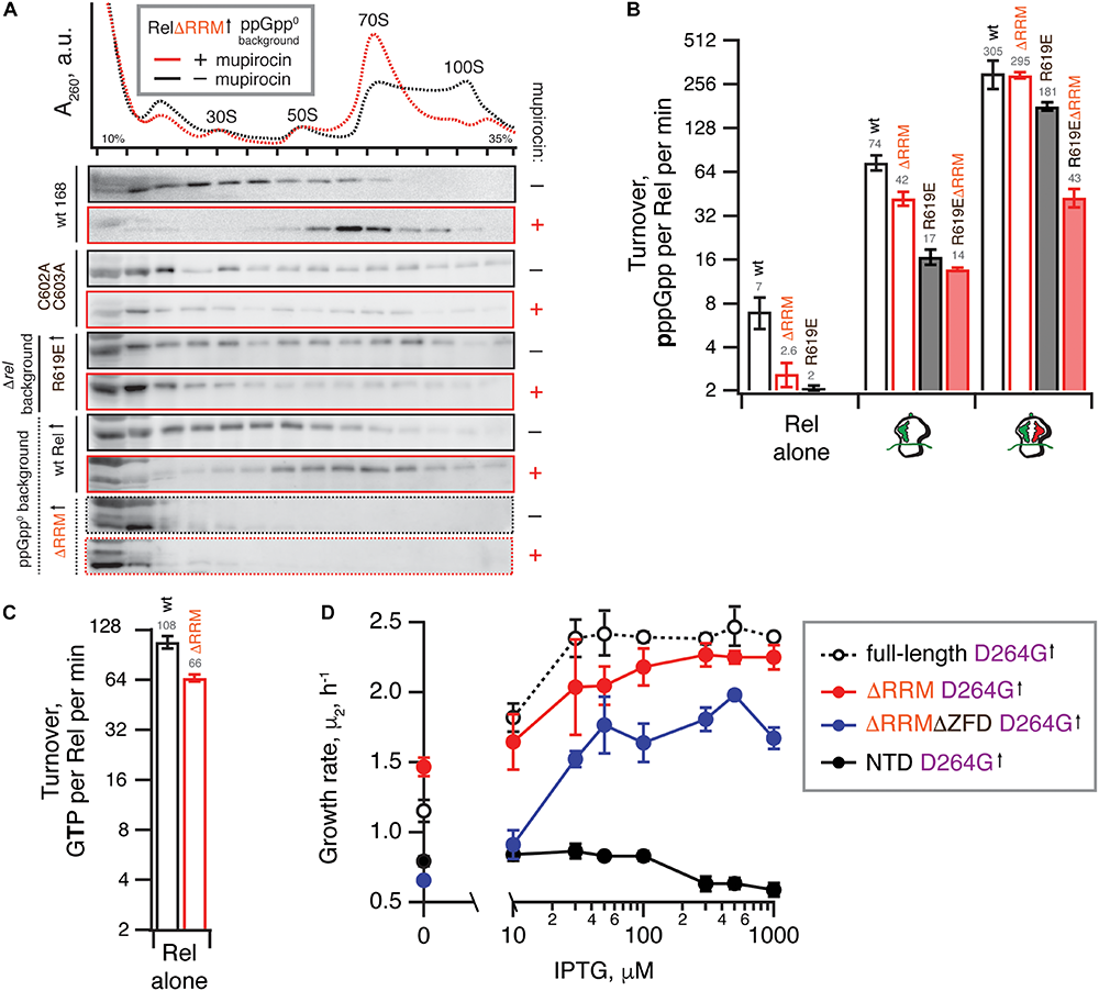 Figure 4. Deletion of the regulatory RRM domain destabilizes Rel binding to starved ribosomal complexes and does not abrogate the hydrolysis activity. (A) Polysome profile and immunoblot analyses of Rel variants expressed either ectopically (↑) under the control of IPTG-inducible Phy–spnak promotor [ΔRRM Rel in ppGpp0 B. subtilis (VHB184), R619E Rel in Δrel B. subtilis (VHB282)] or from the native chromosomal locus [C602A C603A mutant (VHB144)]. Expression of RelΔRRM was induced by 1 mM IPTG for 10 min followed by a 10 min challenge with 700 nM mupirocin. To drive the expression of R619E Rel, the strain was grown in LB supplemented with 1 mM IPTG. In the case of R619E and C602A C603A Rel the culture was treated with mupirocin for 20 min. Polysome profiles of all tested Rel variants are presented in Supplementary Figure S5, and an uncut version of a representative anti-Rel immunoblot is shown in Supplementary Figure S2G. (B,C) The effect of the RRM deletion on synthetic (B) and hydrolytic activity (C). The effects of the RRM deletion and the R619E mutation on Rel synthetic activity were assayed either alone or in the presence of either initiation and starved ribosomal complexes. The error bars represent standard deviations of the turnover estimates by linear regression using four data points. (D) The effects of titratable expression of synthesis-inactive D264G mutants (full-length VHB156, ΔRRM VHB162, ΔRRMΔZFD VHB163 and RelNTD VHB164) on Δrel B. subtilis growing on liquid LB medium at 37°C. The growth rates (μ2) were calculated from three independent biological replicates and the error bars represent standard deviations.