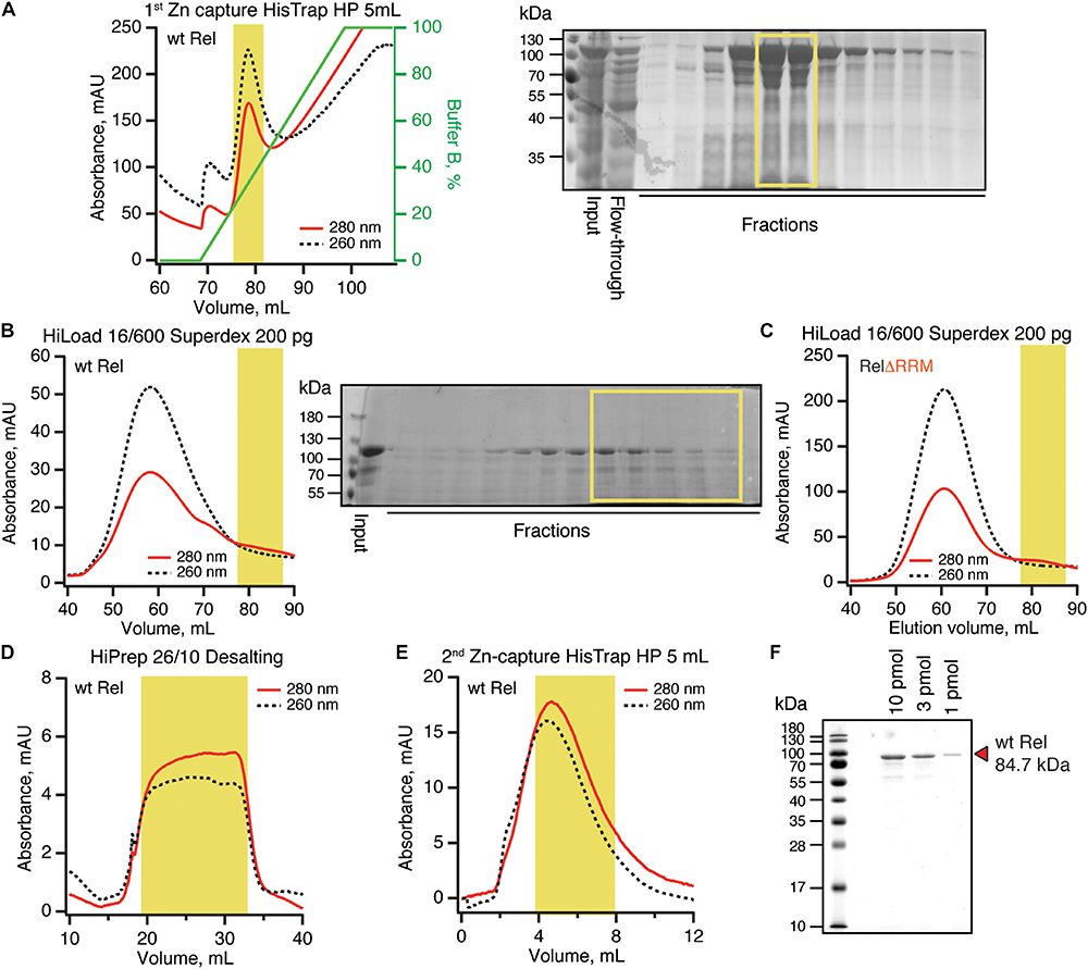 Figure 5. Purification of RNA-free untagged B. subtilis Rel. N-terminally His10-SUMO tagged RelA was overexpressed and purified as described in detail in Materials and Methods. (A) Cells were lysed and subjected to immobilized metal affinity chromatography (IMAC) using a Zn2+-charged HisTrap 5 mL HP column. The fraction corresponding to Rel with the lowest contamination of nucleic acids (highlighted in yellow) was carried forward. Size-exclusion chromatography on HiLoad 16/600 Superdex 200 pg was used to further separate the RNA-free Rel fractions (B: full-length wild type Rel; C: ΔRRM Rel). Following the buffer exchange on HiPrep 10/26 desalting column (D), the boxed-out fractions were pooled and the His10-SUMO tag was cleaved off by the His6-Ulp1 protease. (E) Native untagged Rel was separated from His6-Ulp1 and the His10-SUMO tag by the second round of IMAC. Highlighted fractions were pooled, concentrated, aliquoted, flash-frozen in liquid nitrogen and stored at –80°C. (F) SDS-PAGE analysis of the purified native untagged B. subtilis Rel.