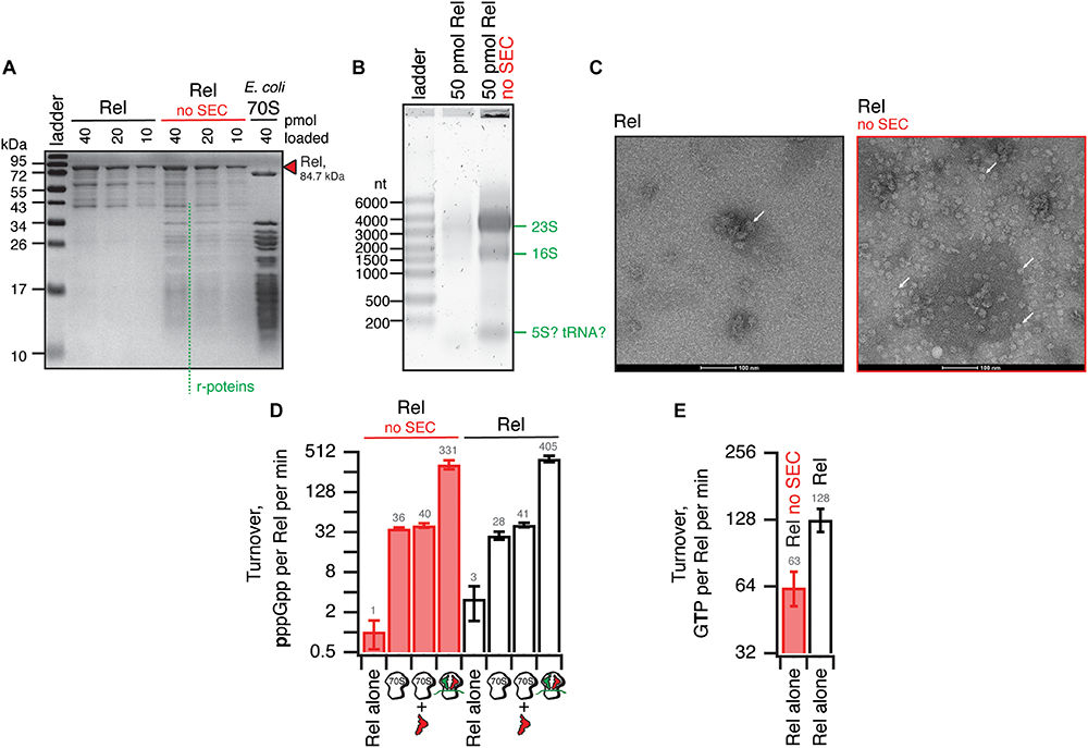 Figure 6. Omission of the size-exclusion chromatography step results in sub-stoichiometric contamination of B. subtilis Rel preparations with E. coli ribosomal particles. (A) SDS-PAGE analysis of wild-type full-length Rel protein purified either as described in Figure 5 or with the SEC step omitted (no SEC). Denaturing agarose gel (B) and negative staining electron microscopy (C) analyses of full-length Rel protein purified with and without the SEC step. Individual ribosomal particles are indicated with white arrows on (C). Effects of the SEC omission on synthetase (D) and hydrolase (E) activity of B. subtilis Rel. The synthetase activity was assayed with either Rel alone or in the presence of 0.5 μM 70S, 70S supplemented with 2 μM deacylated tRNAVal and no mRNA or starved ribosomal complexes (0.5 μM 70S IC(MVF) supplemented with 2 μM deacylated tRNAVal). The error bars represent standard deviations of the turnover estimates by linear regression using four data points.