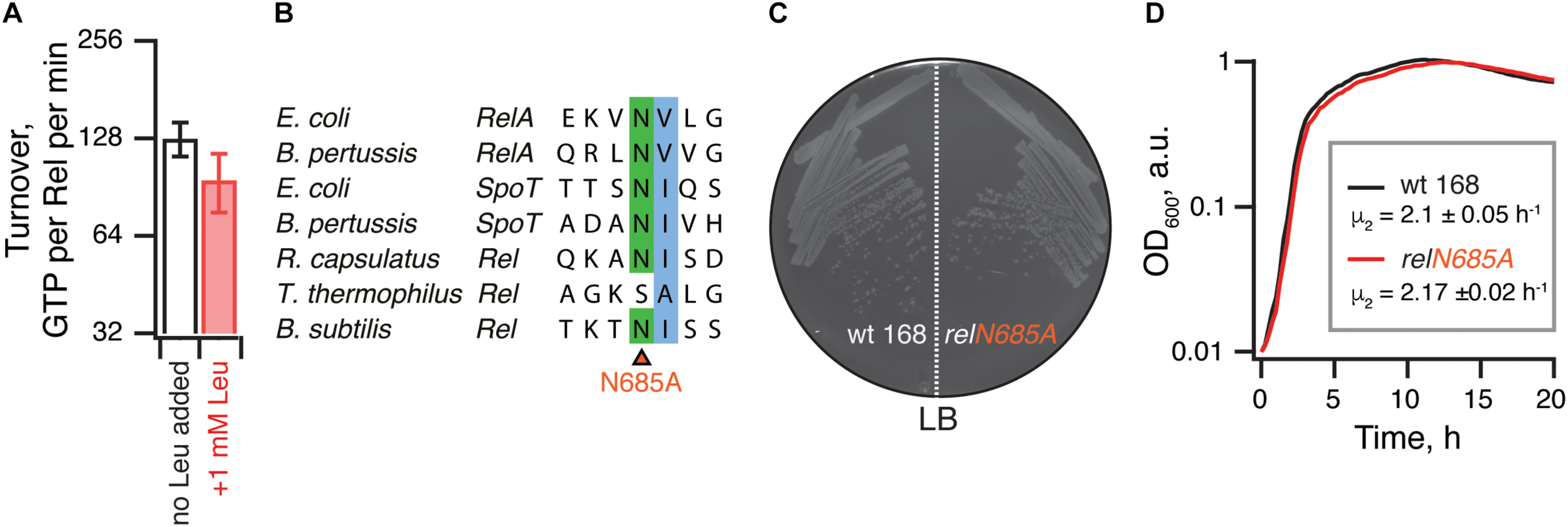Figure 7. The hydrolysis activity of B. subtilis Rel is not activated by branched-chain amino acids binding to the RRM domain. (A) Hydrolase activity of B. subtilis Rel is not stimulated by leucine. The experiments were performed in HEPES:Polymix buffer, pH 7.5 at 37°C in the presence of 5 mM Mg2+. Error bars represent standard deviations of the turnover estimates by linear regression using four data points. (B) Sequence alignment of the B. subtilis N685 region of representative long RSHs. (C,D) Wild-type B. subtilis 168 and isogenic chromosomal relN685A mutant (VHB455) were grown on solid (C) and liquid (D) LB media at 37°C. The plate was scored after 12 h at 37°C. The growth rates (μ2) were calculated from three independent biological replicates and the error bars (shown as shadows) represent standard deviations. Since the liquid media growth experiments were performed in plates format in Bioscreen C growth curve analysis system the OD600 is presented in arbitrary units.