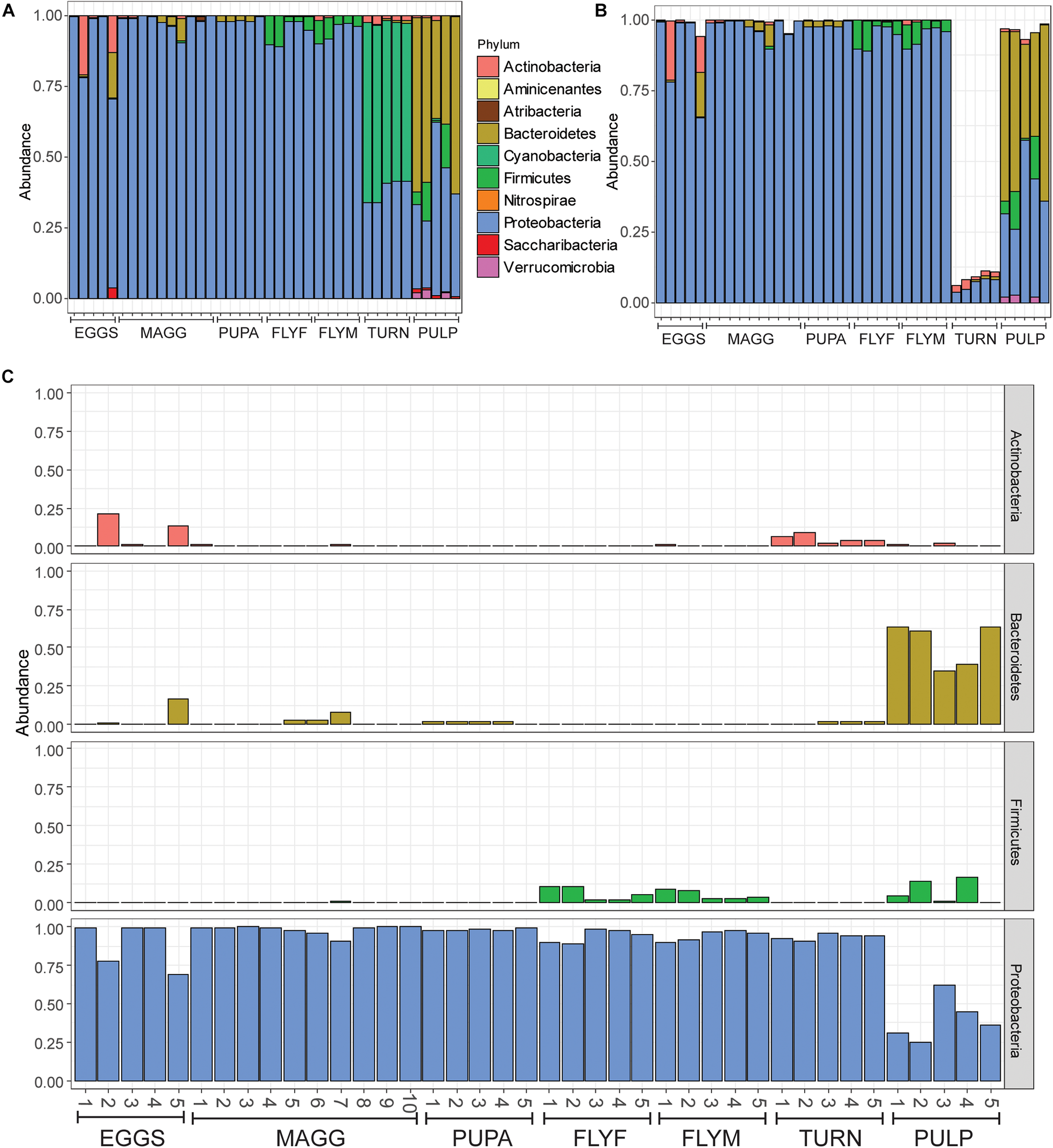 (A) All reads represented as relative abundance, after filtering of low-abundance reads (mean(x) > 5e–5). (B) Bar plot after removal of reads where Class was designated as “Chloroplast” or “Unidentified,” or where Family was designated as “Mitochondria.” Note that over 80% of reads were removed from samples in the “turnip” sample group, which can be explained by the high number of chloroplasts within the tissue. (C) Relative reads of Actinobacteria, Bacteroidetes, Firmicutes, and Proteobacteria in all samples, faceted by phylum. EGGS, Delia radicum eggs; MAGG, Delia radicum larvae; PUPA, D. radicum pupae; FLYF, Gravid female adults of D. radicum; FLYM, Male adults of D. radicum; TURN, Skin of fresh, non-infested Brassica rapa subsp. rapa; PULP, Macerated tissue of a D. radicum-infested individual of B. rapa subsp. rapa.