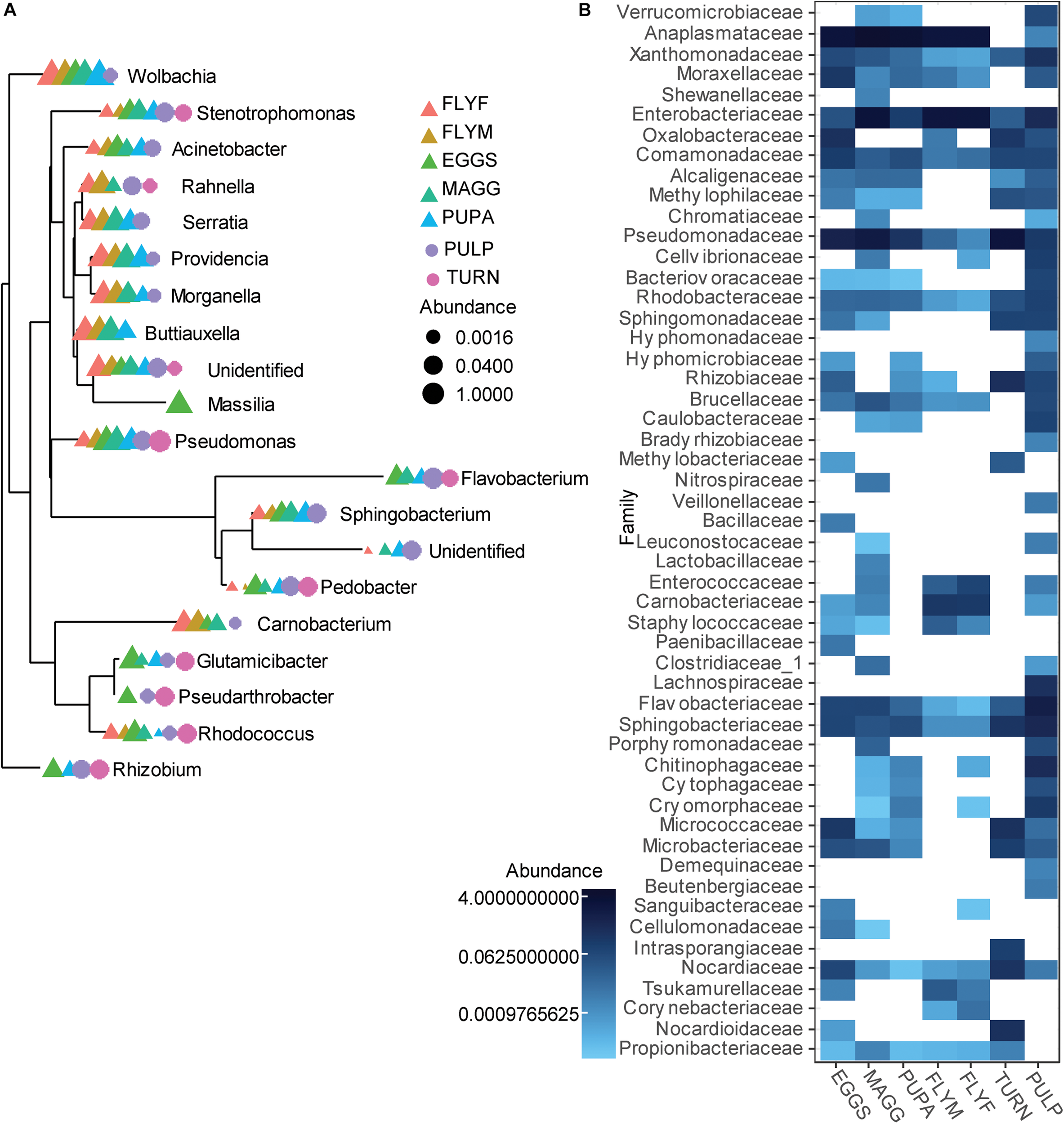 (A) Overview of the 20 most abundant genera associated with a laboratory culture of Delia radicum including samples from multiple life stages, and from fresh and decayed turnips. Data was first agglomerated at the genus level, then merged per sample. (B) Heatmap that shows the relative abundance of reads per sample groups, where abundances were merged at the Family level. EGGS, D. radicum eggs; MAGG, D. radicum larvae; PUPA, D. radicum pupae; FLYF, Gravid female adults of D. radicum; FLYM, Male adults of D. radicum; TURN, Skin of fresh, non-infested Brassica rapa subsp. rapa; PULP, Macerated tissue of a D. radicum-infested individual of B. rapa subsp. rapa.