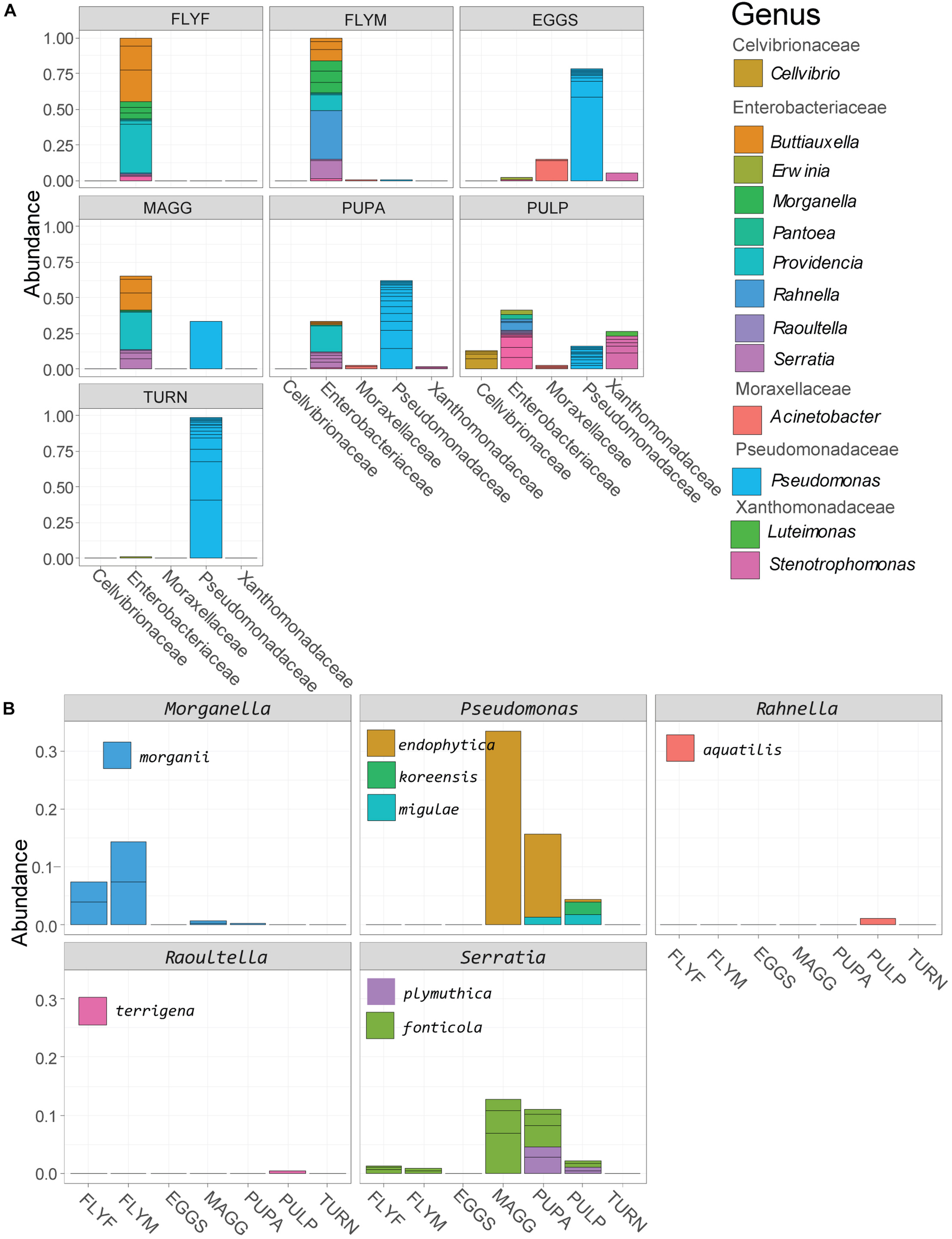 (A) Relative abundance of reads in the class of Gammaproteobacteria, agglomerated by sample group. (B) Gammaproteobacterial strains that could be identified to the species level based on sequencing of the V3–V4 region. MAGG, Delia radicum larvae; PUPA, D. radicum pupae; FLYF, Gravid female adults of D. radicum; FLYM, Male adults of D. radicum; TURN, Skin of fresh, non-infested Brassica rapa subsp. rapa; PULP, Macerated tissue of a D. radicum-infested individual of B. rapa subsp. rapa.