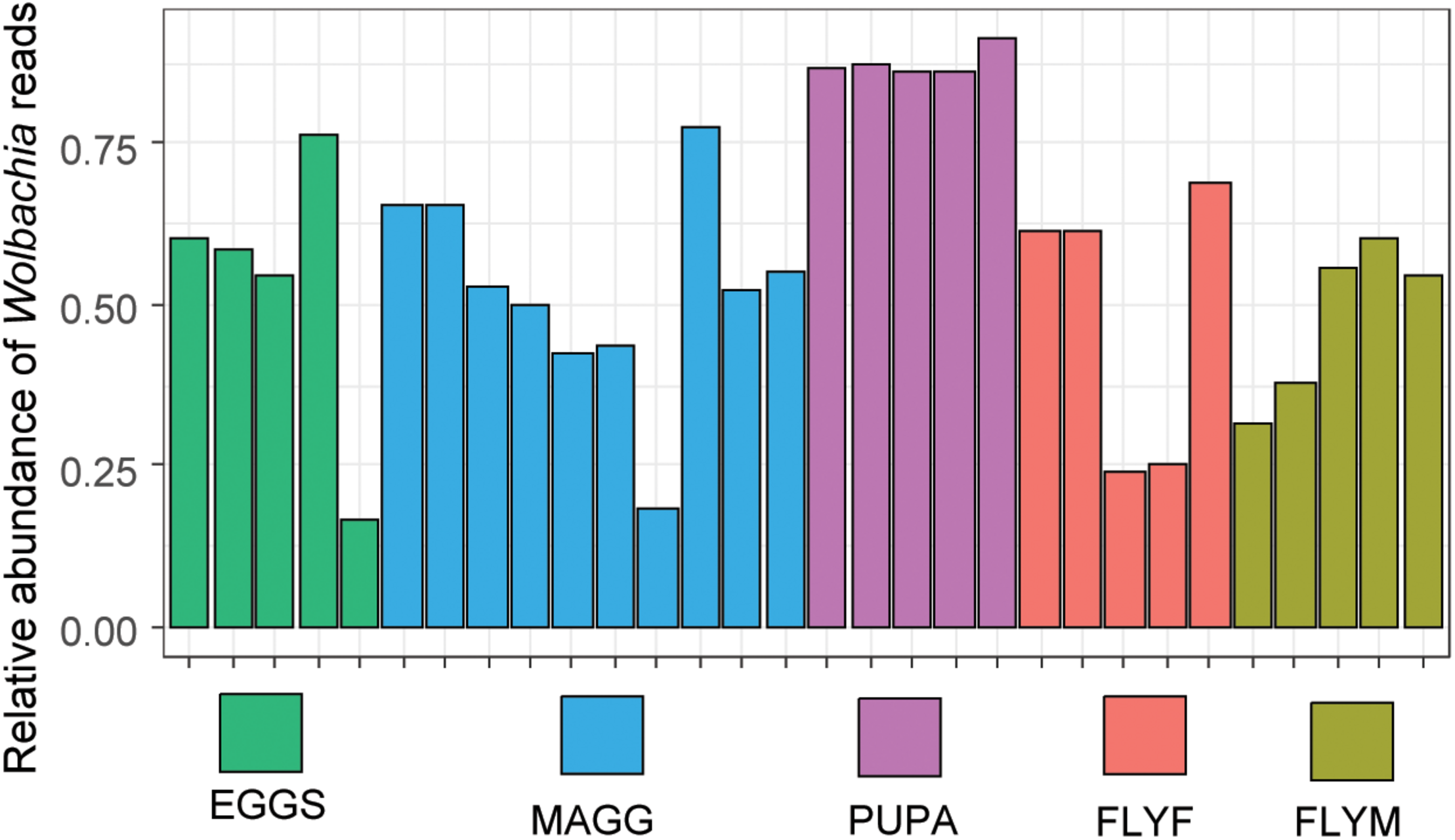 Relative abundance of reads assigned to the genus of Wolbachia in Delia radicum samples. MAGG, D. radicum larvae; PUPA, D. radicum pupae; FLYF, Gravid female adults of D. radicum; FLYM, Male adults of D. radicum; TURN, Skin of fresh, non-infested Brassica rapa subsp. rapa; PULP, Macerated tissue of a D. radicum-infested individual of B. rapa subsp. rapa.