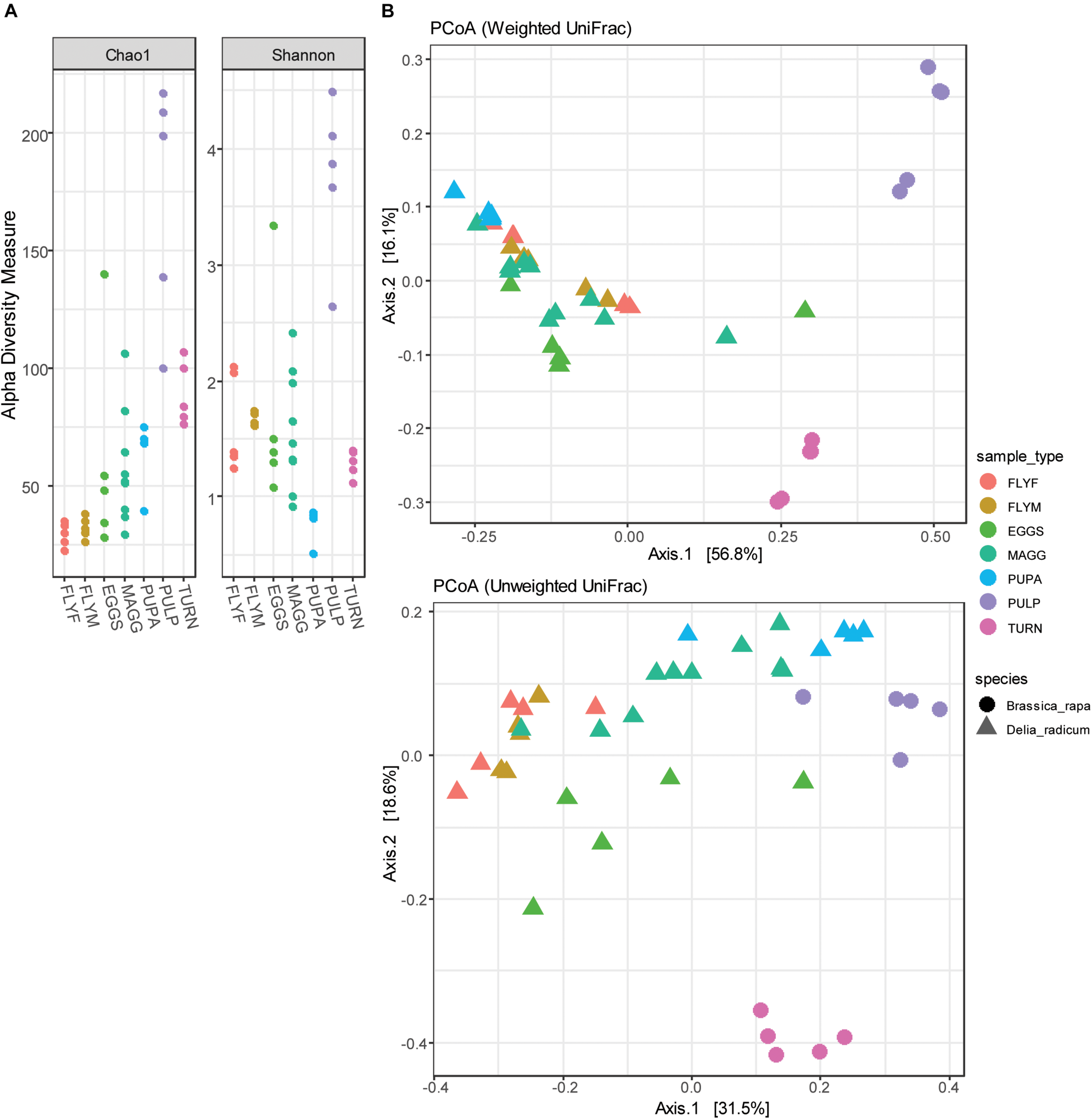 (A) Dot plots of the alpha diversity (Chao1 and Shannon-Weaver indices) of Delia radicum-associated microbiota and their diet substrates pre feeding (turnip_skin) and post feeding by D. radicum larvae (turnip_pulp). (B) Principle coordinate analysis of 30 D. radicum and 10 Brassica rapa samples, based on unweighted and weighted UniFrac distances. MAGG, D. radicum larvae; PUPA, D. radicum pupae; FLYF, Gravid female adults of D. radicum; FLYM, Male adults of D. radicum; TURN, Skin of fresh, non-infested B. rapa subsp. rapa; PULP, Macerated tissue of a D. radicum-infested individual of B. rapa subsp. rapa.