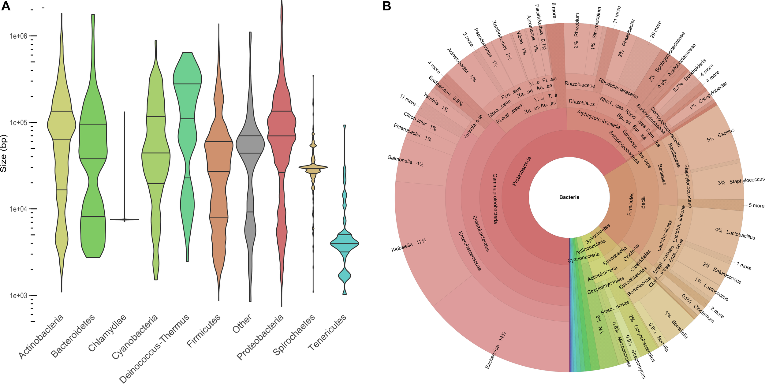 Figure 1. Description of the COMPASS database. (A) Violin plot displaying plasmid size distribution (log10) among the main phyla (n = 12,084). The phylum entitled “Other” is composed of 57 plasmids from 12 minority phyla (n < 25) and 129 plasmids missing taxonomy data. (B) Krona plot showing the compositions of taxa and taxonomic ranks (n = 12,084).
