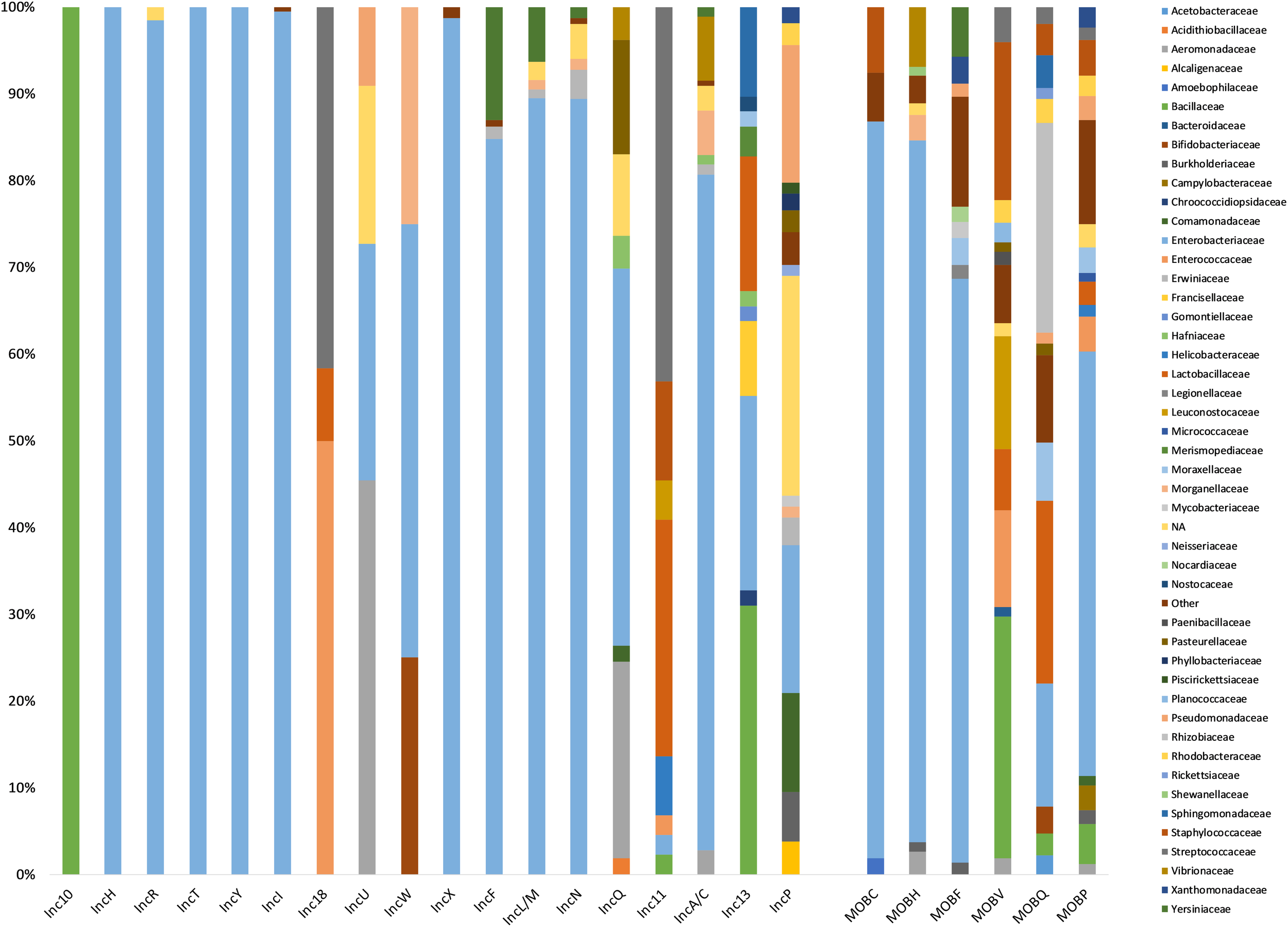 Figure 2. Host range distribution. Percentage of bacterial families in known replicon types (2469 plasmids) and MOB types (5229 plasmids). Bacterial families accounting for less than 1% within replicon types were represented together in the family “Other.”