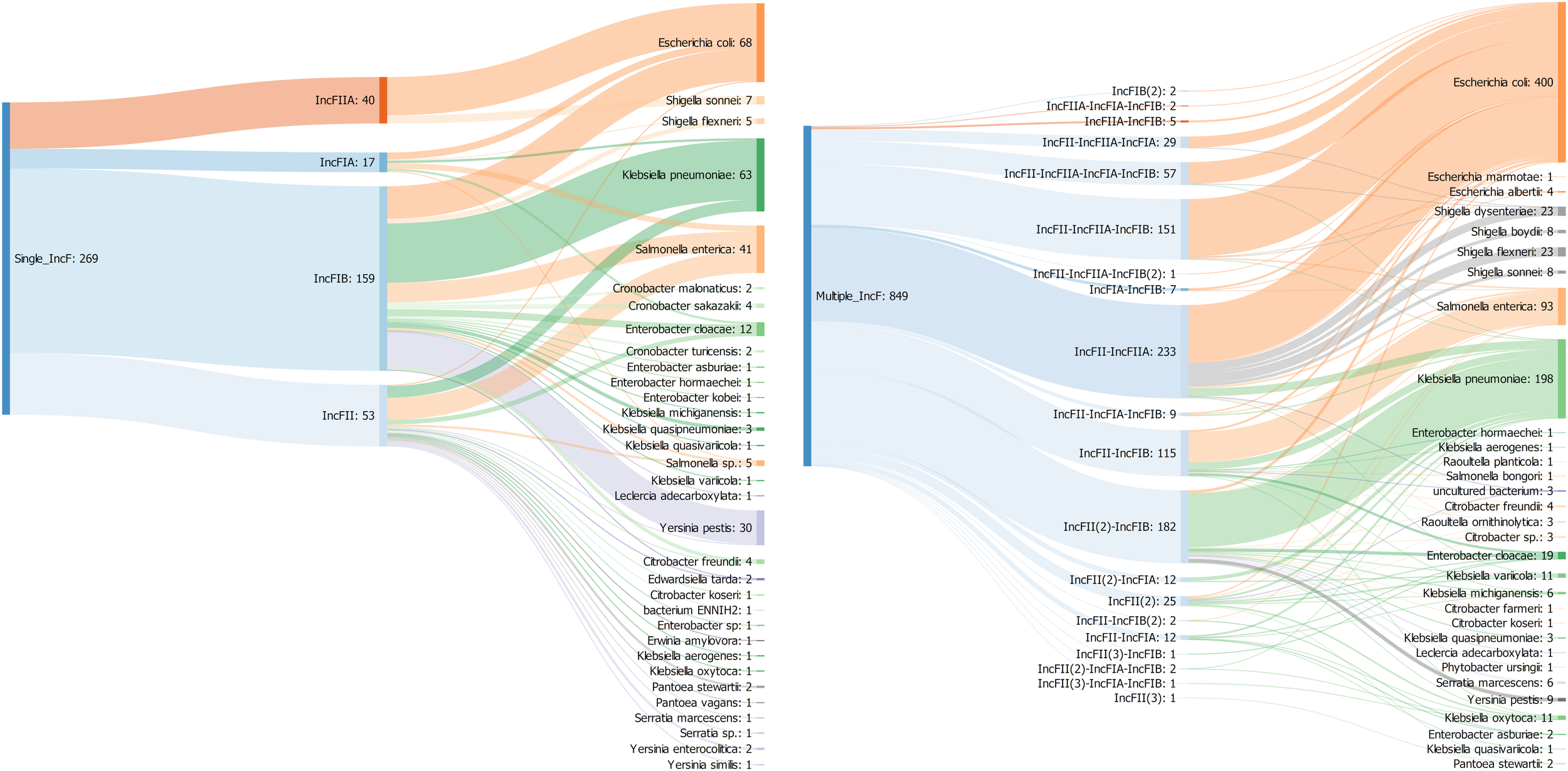 Figure 4. Sankey diagram showing the associations between replicon types and replicon profiles with bacterial species in 1118 IncF plasmids. The number in brackets refers to the copy number of a particular IncF allele.