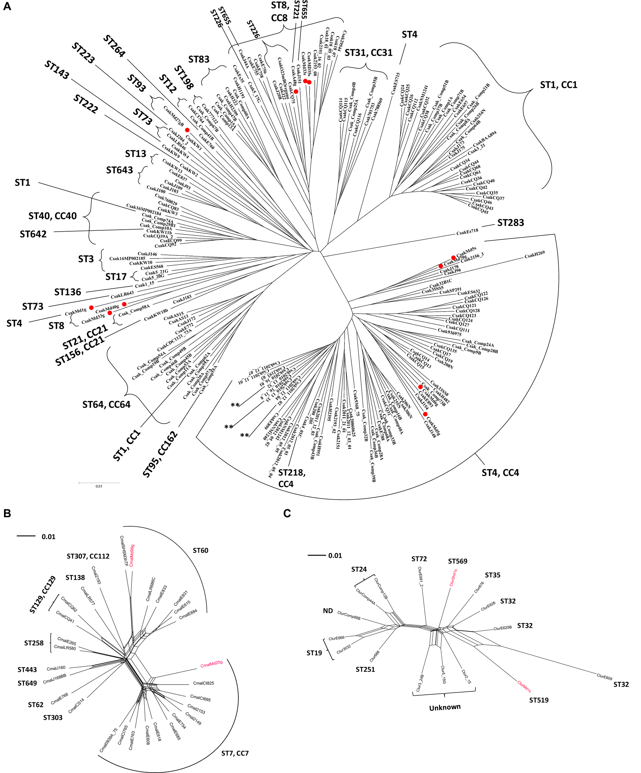 (A) Phylogenetic Neighbor net (SplitsTree4) analysis of representatives of C. sakazakii showing a bi-directional nature (along the tree X-axis). (B) Phylogenetic Neighbor net (SplitsTree4) analysis of representatives of C. malonaticus. The tree was generated from the gene-difference matrix (data not shown). (C) Phylogenetic Neighbor net (SplitsTree4) analysis of representatives of C. turicensis showing a bi-directional nature (along the tree X-axis). The tree was generated from the gene-difference matrix (data not shown). The microarray experimental protocol as described by Jackson et al. (2011) and as modified by Tall et al. (2015) was used for the interrogation of the strains for the analysis. The phylogenetic trees illustrate that the Cronobacter microarray could clearly separate these Cronobacter strains into distinct clusters based on ST phylogeny. Fly strains are identified by a red dot or red font. The scale bar represents a 0.01 base substitution per site. ND denotes not determined.