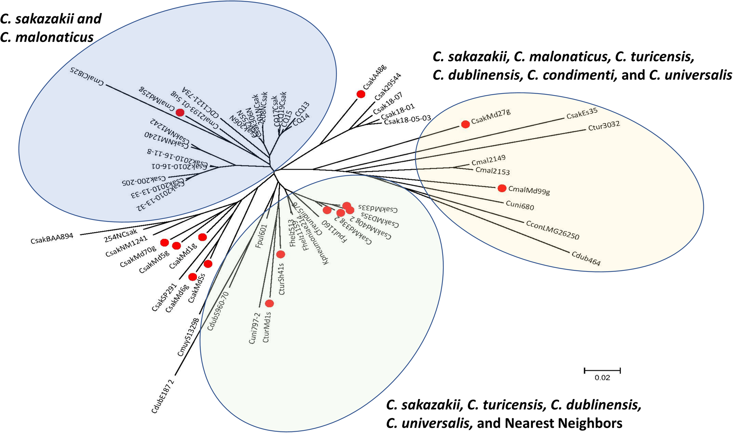 Phylogenetic analysis among 15 fly Cronobacter strains (identified with a red dot) and 45 other Cronobacter and phylogenetically-related strains was inferred using the Neighbor-Joining method using the 19,287 Cronobacter gene targets (Saitou and Nei, 1987) of the FDACRONOa520845F microarray. The optimal tree with the sum of branch length = 1.86949337 is shown. The tree is drawn to scale, with branch lengths in the same units as those of the evolutionary distances used to infer the phylogenetic tree. The evolutionary distances were computed using the p-distance method (Nei and Kumar, 2000) and are in the units of the number of base differences per site. The analysis involved 60 strains evaluated by using the FDA Cronobacter microarray. All positions containing gaps and missing data were eliminated. There were a total of 21,402 positions in the final dataset. Evolutionary analyses were conducted in MEGA7 (Kumar et al., 2016). These Cronobacter and phylogenetically related strains were analyzed from the presence-absence gene matrix (data not shown). The microarray experimental protocol as described by Jackson et al. (2011) and as modified by Tall et al. (2015) was used for the interrogation of the strains for this analysis. The phylogenetic tree illustrates that the Cronobacter microarray could clearly separate the seven species of Cronobacter with each species forming their own distinct cluster, and that representative fly strains clustered (identified with red dots) according to their species taxon. The scale bar represents a 0.02 base substitution per site.