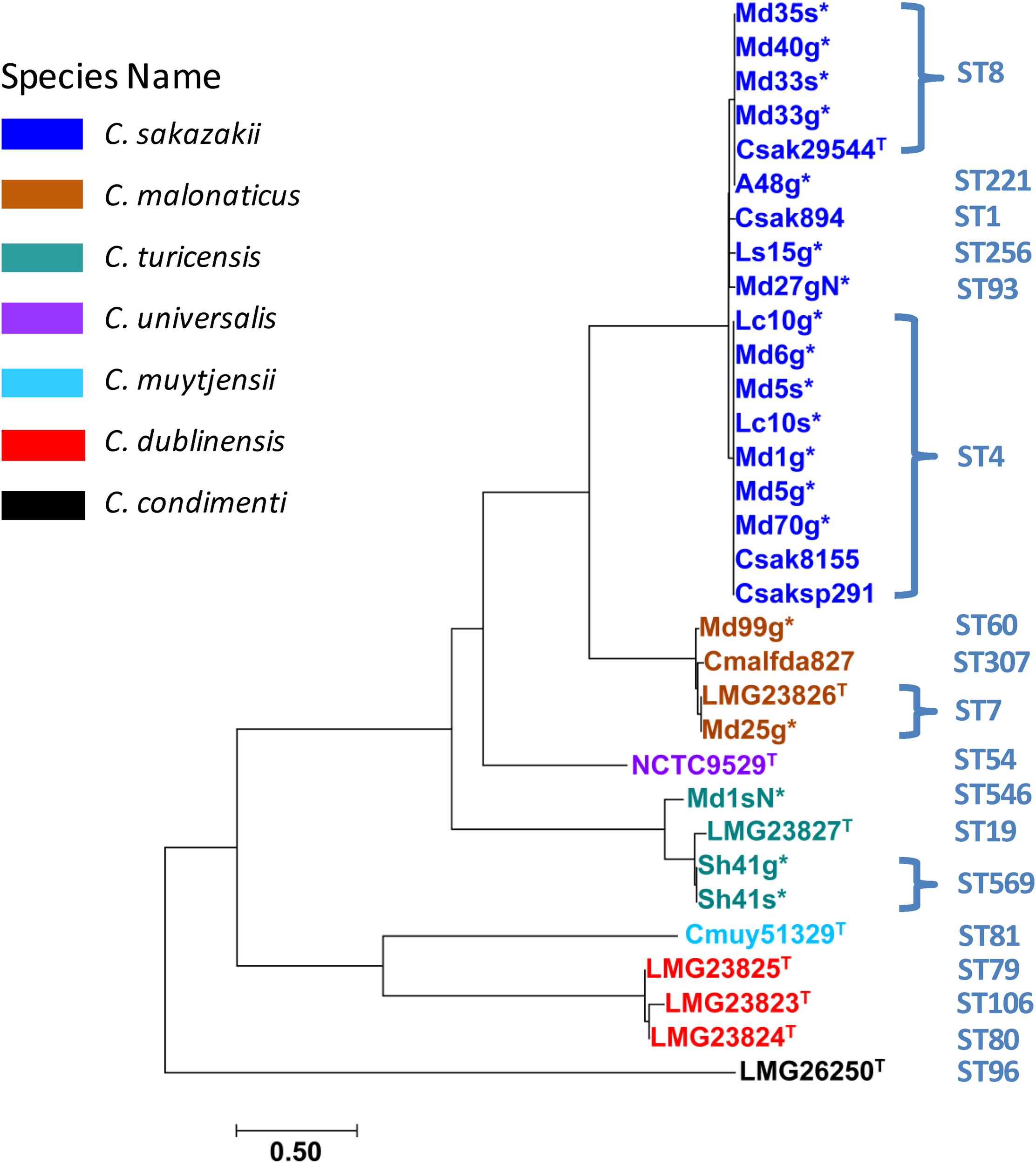 During the surveillance study reported by Pava-Ripoll et al. (2012), 19 Cronobacter strains were obtained from filth flies from four fly species belonging to the families Muscidae, Calliphoridae, Sarcophagidae, and Anthomyiidae (one fly was identified only to the family level). Results are shown in Table 1. Two C. malonaticus, three C. turicensis and 14 C. sakazakii were identified from the alimentary canals and external surfaces of the filth flies. Interestingly, on five occasions, Cronobacter strains were isolated from both the alimentary canal (strain name labeled with suffix “g”) and the external body surface (strain name labeled with suffix “s”) of the same fly. In three of these instances, a fly was found that carried the same Cronobacter species at both anatomical sites: a red-tailed flesh fly carried C. turicensis serogroup unknown, ST569 strains (Sh41g and Sh41s), a house fly carried C. sakazakii serogroup O:1, ST8 strains (Md33g and Md33s), and a blowfly carried C. sakazakii serogroup O:3, ST4 strains (Lc10s and Lc10g). Another housefly carried a mixture of C. sakazakii ST4 strains differing only by serogroup designation: on its surface a C. sakazakii serogroup O:3 (Md5s), and in its alimentary canal a C. sakazakii serogroup O:2 strain (Md5g). Lastly, a C. turicensis ST546 strain (Md1sN, CturO:Unknown) was obtained from the body surface of another housefly and Md1g, a C. sakazakii serogroup O:2, ST4 strain was obtained from its alimentary canal. Two other houseflies carried C. malonaticus ST60 and ST7 strains (Md99g and Md25g, serogroups Cmal O:1 and Cmal O:2, respectively) in their alimentary canals. In addition to the C. malonaticus, C. turicensis, and C. sakazakii strains described above, there were seven other C. sakazakii isolated from filth flies that were identified as a ST93 C. sakazakii serogroup unknown (Md27gN), and two C. sakazakii ST8: one (Md35s) possessing serogroup CsakO:Unknown and the other (Md40g) possessed a CsakO:2 serogroup determinants. Additional C. sakazakii strains were found associated with these flies and include two ST4 C. sakazakii strains: (Md6g, Md70g), a ST221 strain (Ath48g), and a ST256 (Ls15g) possessing CsakO:3, CsakO:2, CsakO:Unknown, and CsakO:1 serogroup determinants, respectively. Taken together, MLST analysis of these Cronobacter strains (shown in Table 1) demonstrated that there were nine different STs found among the filth fly strains.
