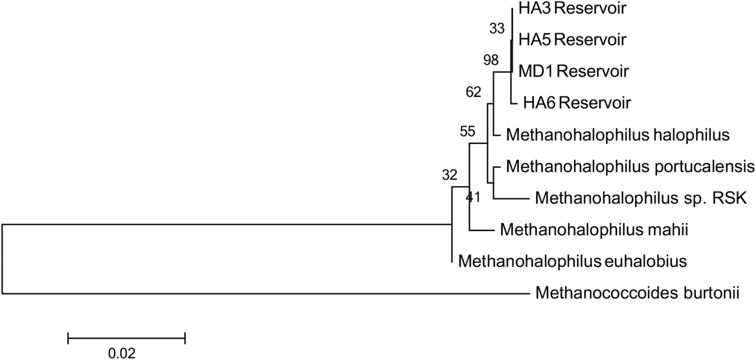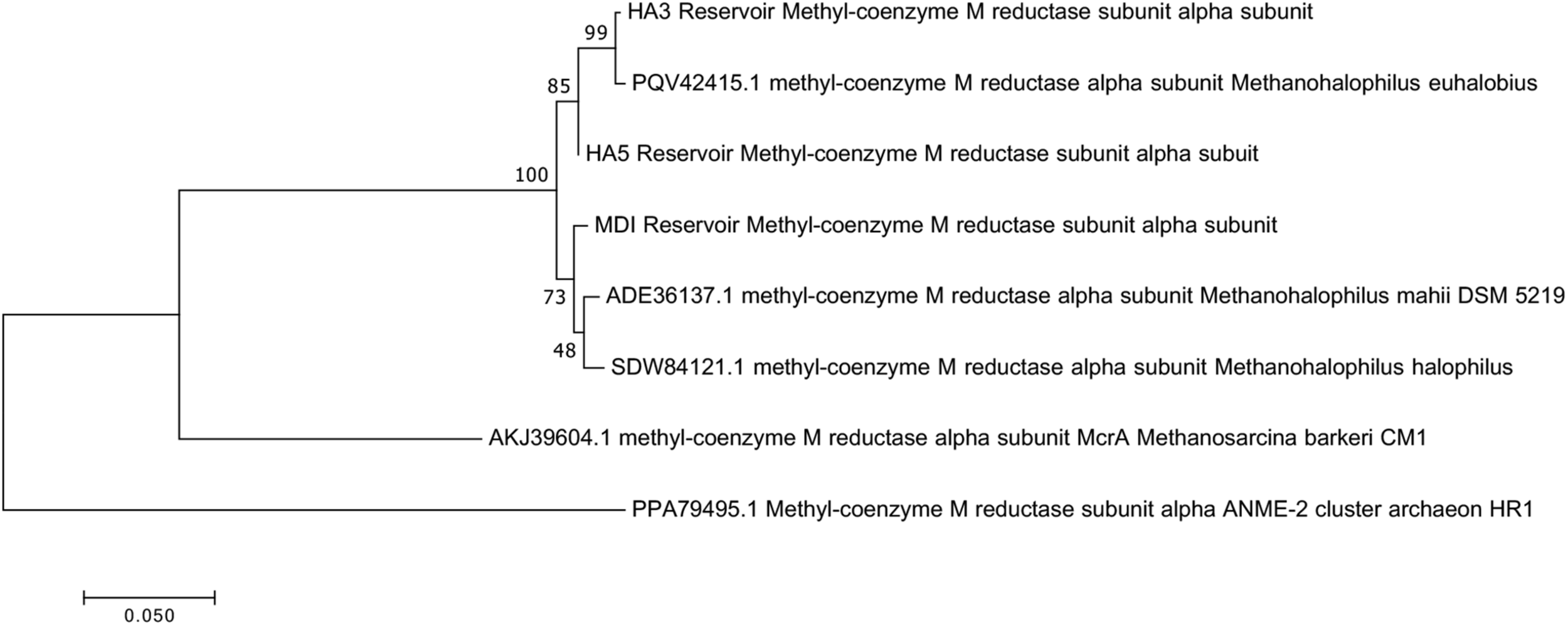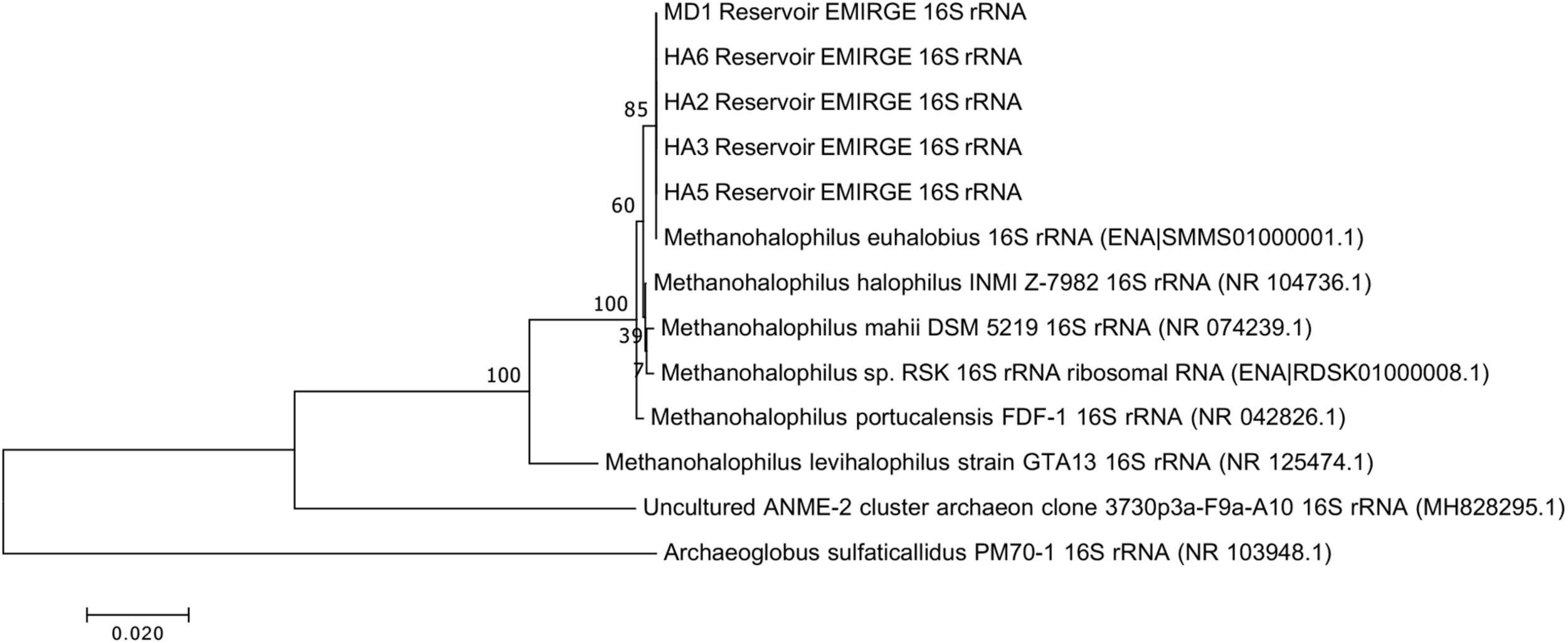 Since not all of the MAGs had discernable 16S rRNA genes, small subunit ribosomal rRNA genes for the Methanohalophilus sp. were retrieved from the metagenomes and compared to close relatives (Figure 2). Using shorter sequences (868 bp) from all of the reservoirs, no discernable difference existed between these new sequences and Methanohalophilus euhalobius. Using slightly longer sequences (1339–1475 bp) that did not include data from HA2, a slight difference can be seen between HA3, HA6 and the other wells, which matched exactly to M. euhalobius (Supplementary Figure 1). To further examine relatedness, we prepared a concatenated ribosomal protein phylogeny using ribosomal proteins (Figure 3). This tree shows that the reservoir signatures are all similar, but in this phylogeny, M. euhalobius is not the nearest relative, instead, it is the clade that includes Methanohalophilus halophilus. To further examine relatedness, we extracted genes for methyl coenzyme reductase alpha subunit (mcrA) from HA3, HA5, and MD1 MAGs. The phylogeny of these functional proteins, which are also utilized as phylogenetic markers for methanogens, shows HA3 being identical, and HA5 being closely related to M. euhalobius (Figure 4). The McrA from MD1 is more related to M. halophilus.