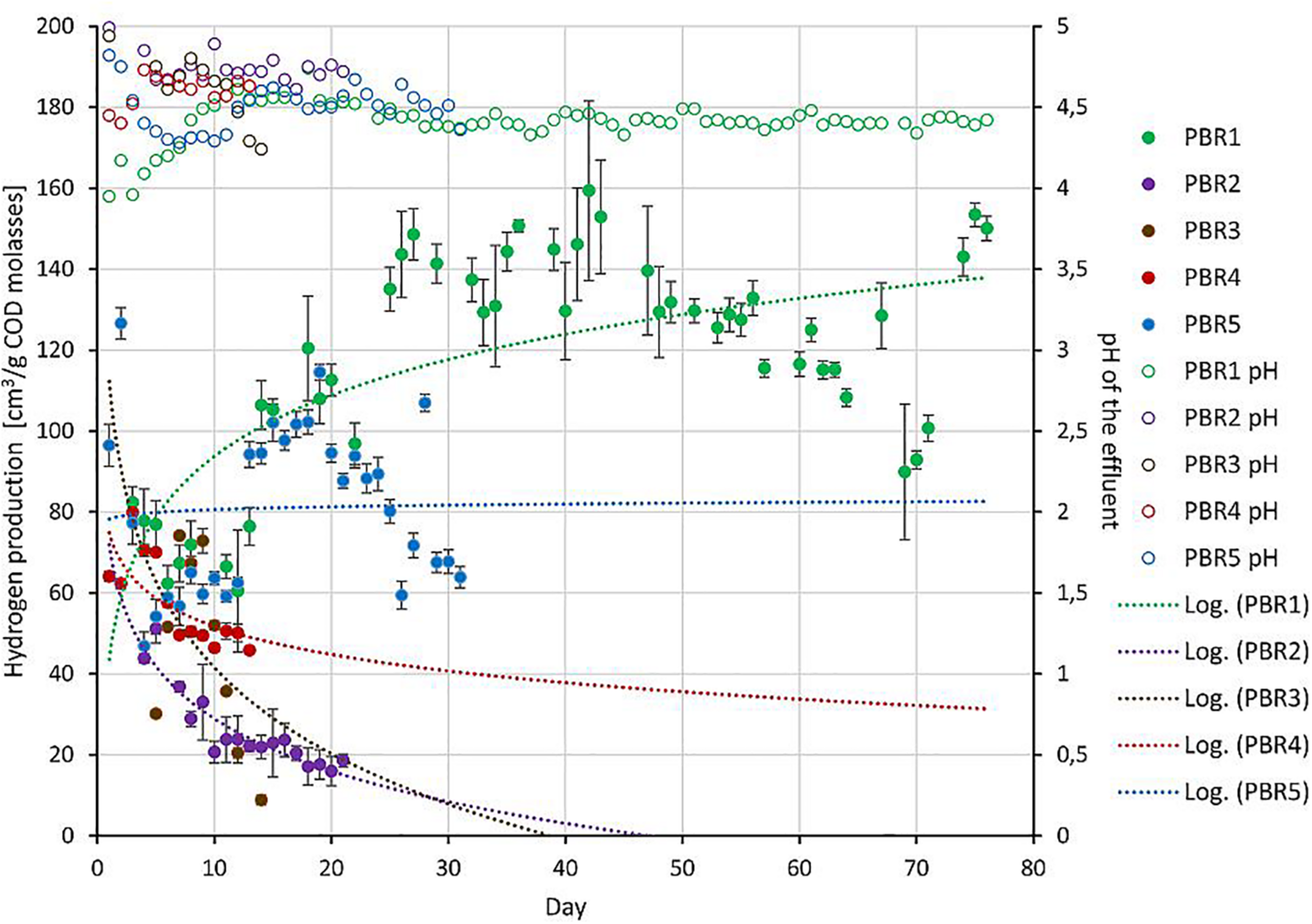 Figure 1. The long-term performance of PBRs tested in this study: hydrogen production (solid circles, left axis) and pH of the effluents (open circles, right axis) from bioreactors. Since the operation periods were different, trend lines were added for hydrogen-production data sets.