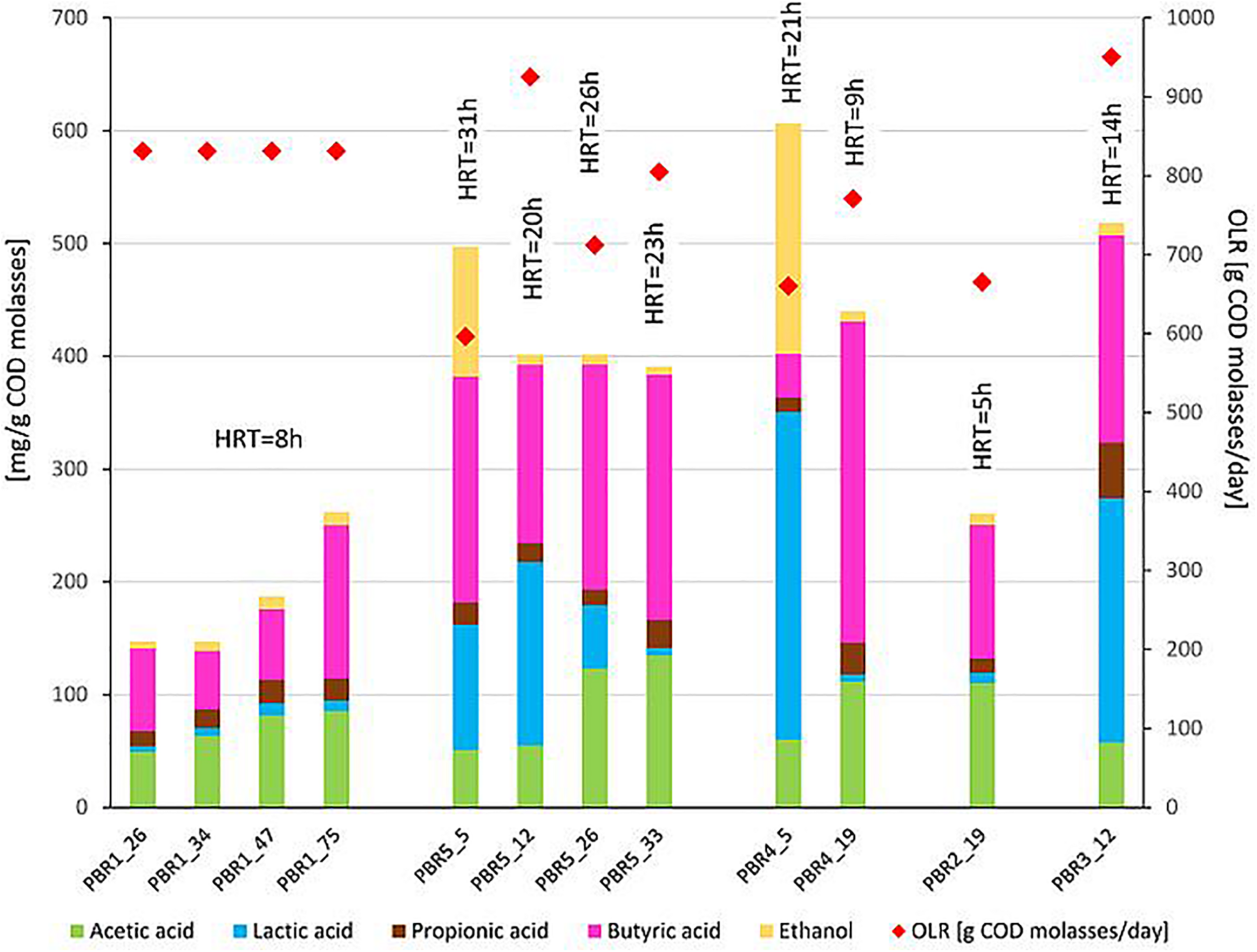 Figure 2. Non-gaseous fermentation products expressed in mg per g of COD of molasses (bars, left axis) and substrate concentration in g of COD of molasses per day (diamonds, right axis) supplied to the bioreactors in selected time points of operation. The composition of fermentation products was analyzed using high-performance liquid chromatography. The data comes from two parallel measurements. HRT is shown over each bar.