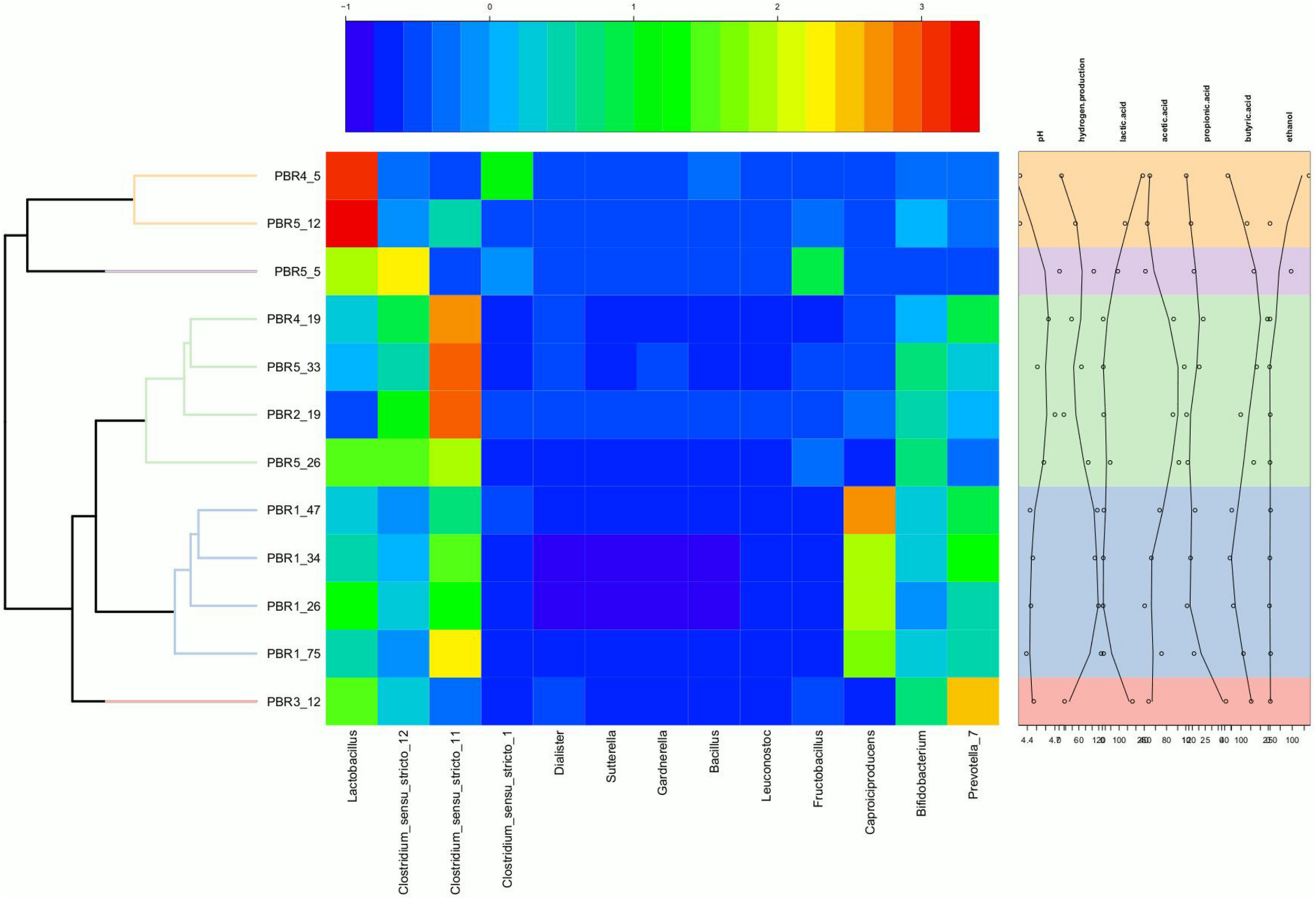 Figure 4. Heatmap showing the relative abundance of genera in the individual PBRs in selected time points with annotation of measured metabolites and pH. The heatmap was generated in R (Heatplus package, annHeatmap2 function) using the relative abundance of the observed genera. For clarity, all genera with summarized relative abundance lower than 0.1% were removed. Rows were clustered using average-linkage hierarchical clustering based on the Bray–Curtis dissimilarity matrix of the dataset (‘vegdist’ from the vegan package).
