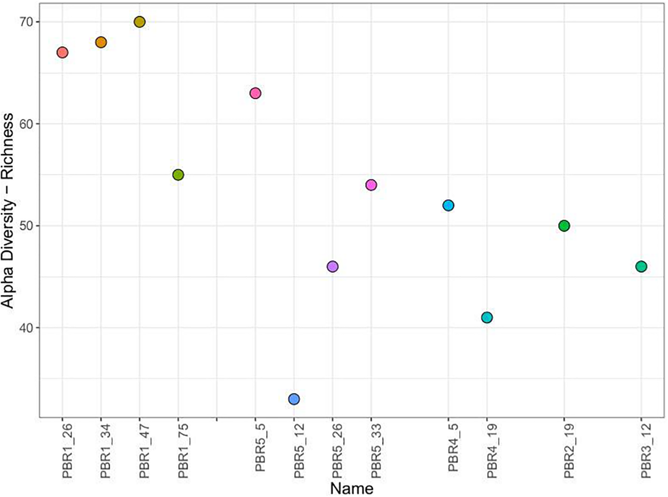 Furthermore, the microbial communities (samples PBR1_26, PBR1_34, PBR1_47, PBR1_75) sampled from the PBR1 producing hydrogen most stably showed the highest biodiversity measured by taxonomic richness (Figure 5) and evenness (Shannon and Simpson indices) (Supplementary Figure 1).