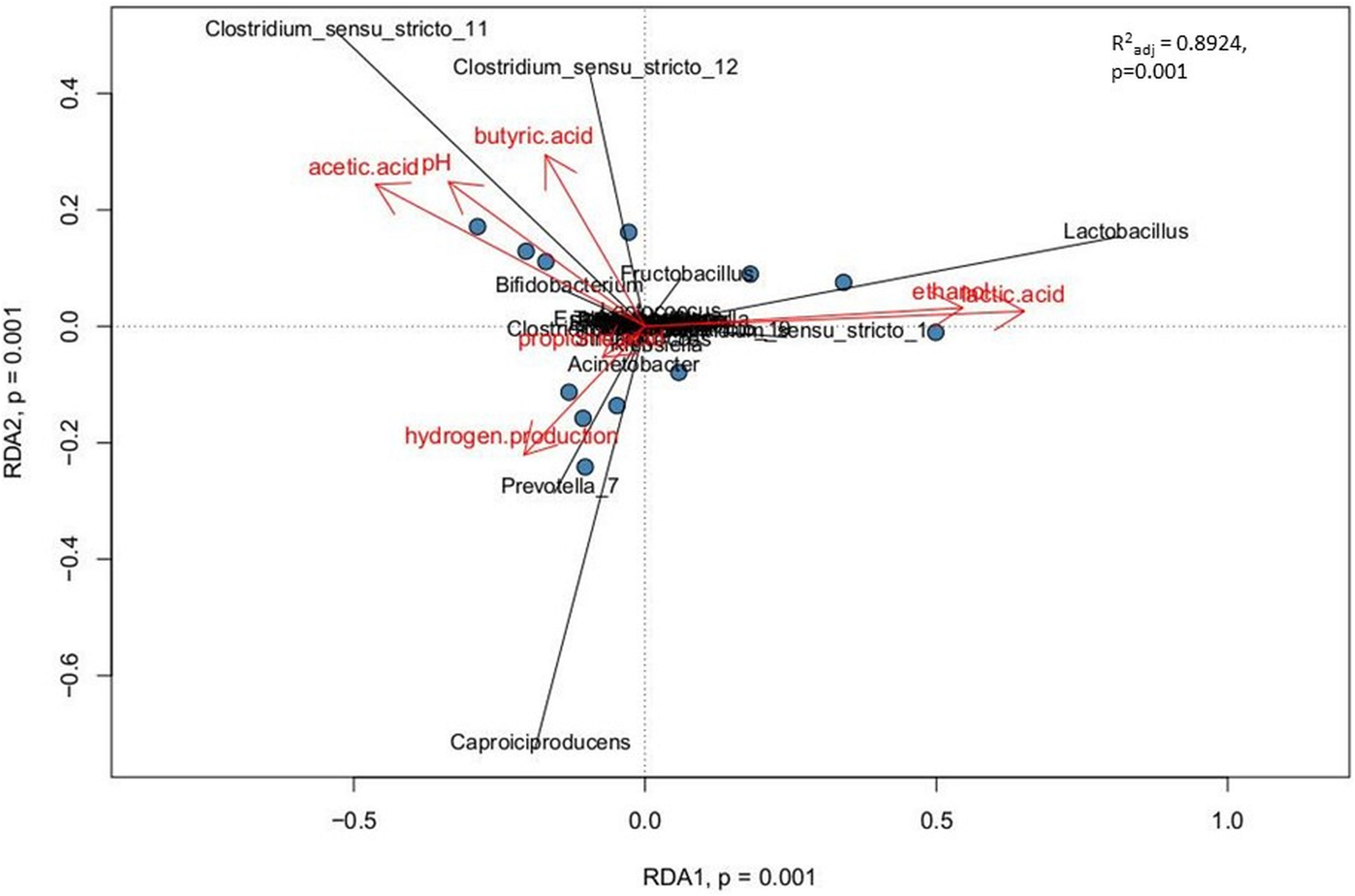 Relationships between explanatory variables (the fermentation products, pH of the effluents) and genera with relative abundance at least 1% were visualized by using a redundancy analysis (RDA) on non-rarified center-log-ratio genera count tables. The RDA integrates the targeted metabolomic data with the analyses of sample biodiversity in all bioreactors. This model explains 89.2% of the variation in the data (R2adj = 0.8924). The adjusted R2 measures the unbiased amount of explained variation. The analysis presents statistically significant correlations (p = 0.001, ANOVA permutation test) (Figure 6).