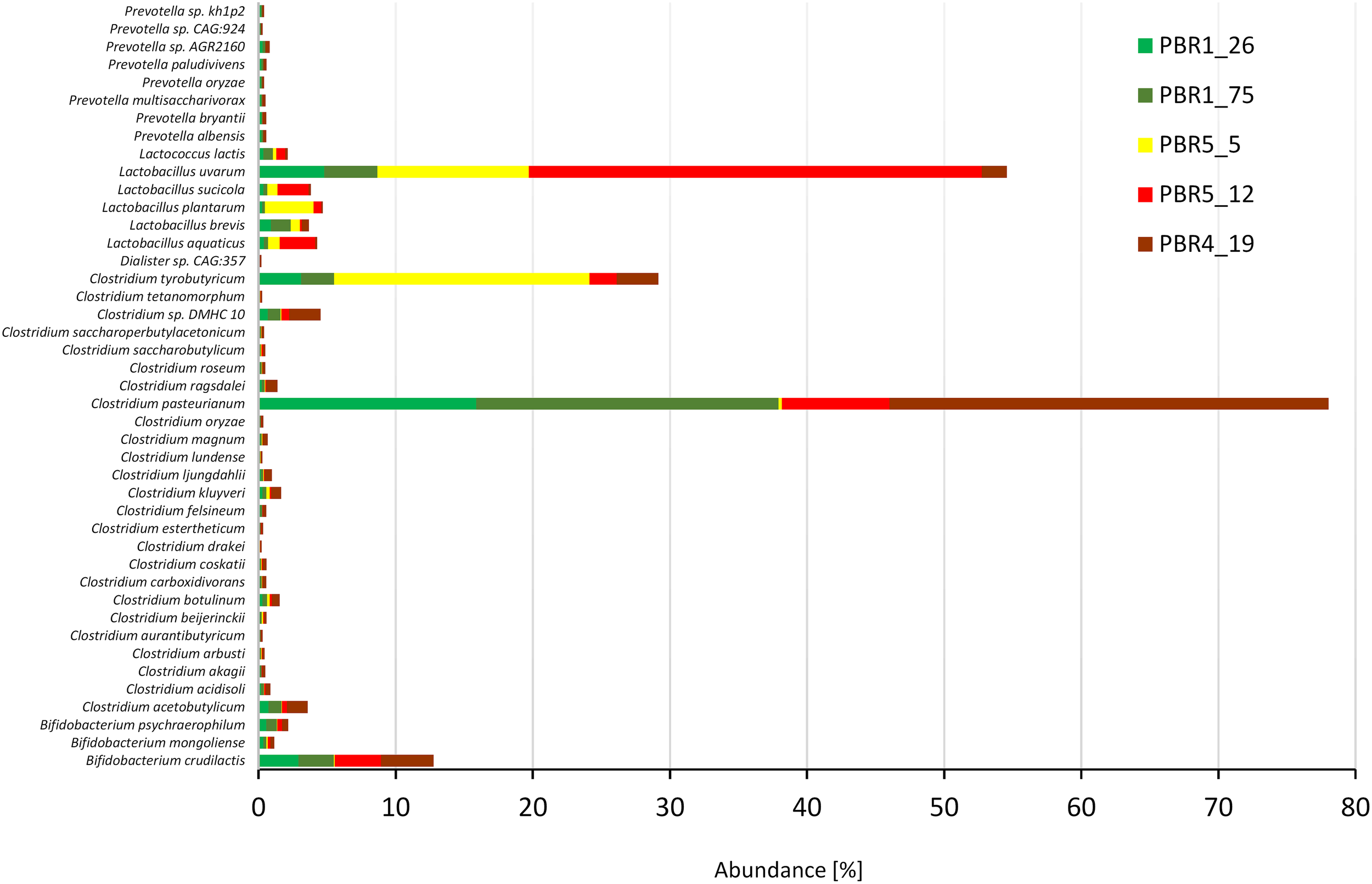 The 43 most dominant species with an abundance >0.1% belonged to six genera: Clostridium (25 species with C. pasteurianum, C. tyrobutyricum, C. acetobutylicum, C. kluyveri, Clostridium sp. DMHC 10), Lactobacillus (5 species with L. uvarum, L. plantarum, L. aquaticus, L. brevis and L. sucicola), Bifidobacterium (3 species with B. crudilactis), Prevotella (8 species) as well as Lactococcus lactis and Dialister sp. CAG:357. Strong quantitative differences between the contributions of Clostridium and Lactobacillus species in the bioreactors with different efficiencies of hydrogen production was also confirmed (Figure 7). The ratios Clostridium:Lactobacillus in the PBRs producing more than 100 cm3 hydrogen/g COD of molasses, PBR1 and PBR5 (sample PBR5_5) were 3:1 and 5:6, respectively, whereas in the PBR5 (PBR5_12) and PBR4 (PBR4_19) producing less than 50 cm3 hydrogen/g COD of molasses, they were 1:4 and 10:1, respectively. Interestingly, C. pasteurianum most abundant in PBR1 was replaced by C. tyrobutyricum in PBR5 during the period of its hydrogen production above 100 cm3 hydrogen/g COD of molasses. The ratios calculated based on metanogenic data show a comparable tendencies to those calculated based on 16S rRNA amplicons. They are compared with the results of other studies (Table 3) and discussed in the “Discussion” section. The contribution of B. crudilactis in all bioreactors was comparable and L. uvarum was the most abundant Lactobacillus species.