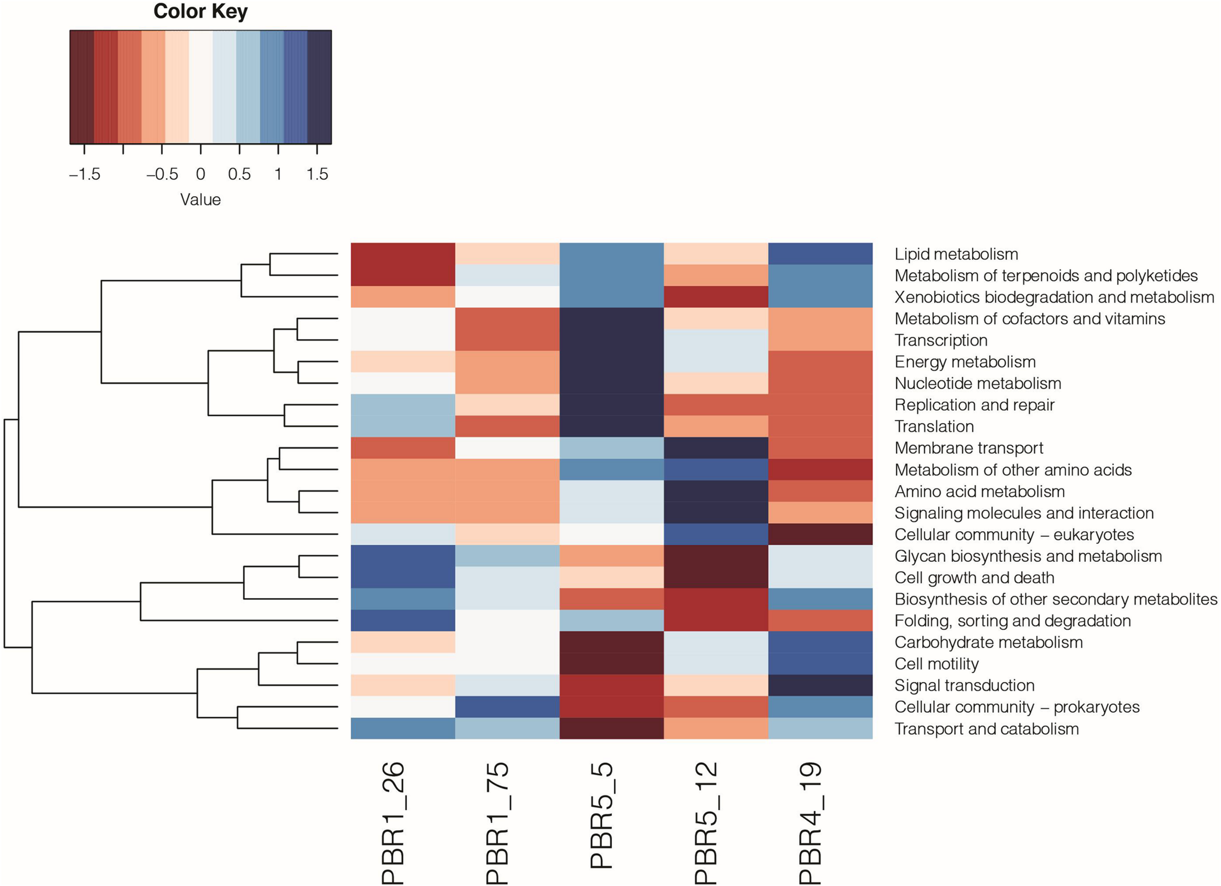 Figure 8. Metabolic potential based on KEGG (level 2) analysis of the microbial communities selected out in PBR1 (PBR1_26, PBR1_75), PBR5 (PBR5_5, PBR5_12) and PBR4 (PBR4_19).