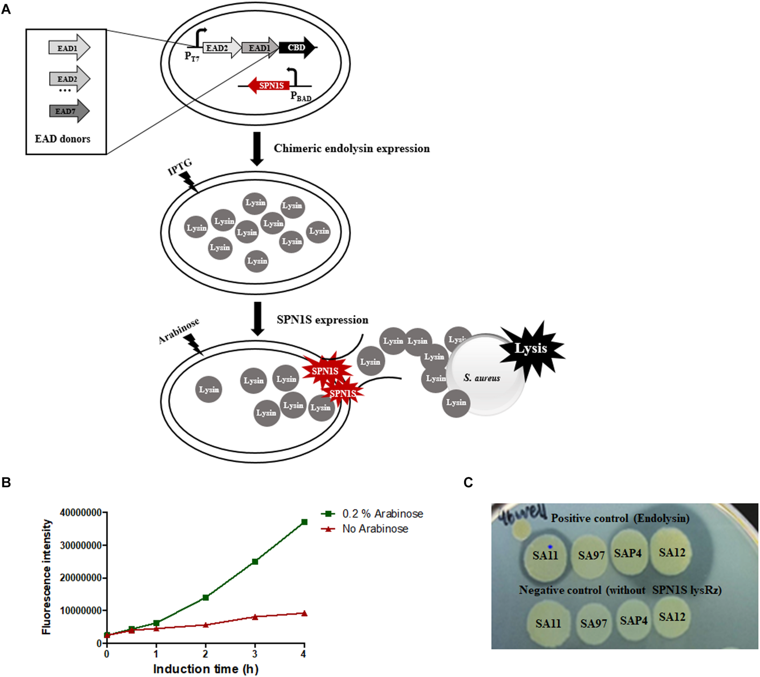 Figure 1. Development of screening system on a 96-well microplate. (A) Scheme of the random domain screening method. (B) EGFP released from SPN1S-induced lysis in host E. coli cells. Cells without induction IPTG for EGFP expression and arabinose for SPN1S lysRz expression) were used as a control. (C) Clones for positive and negative controls were cultured with 0.2% arabinose overnight on the lawn of autoclaved S. aureus RN4220.