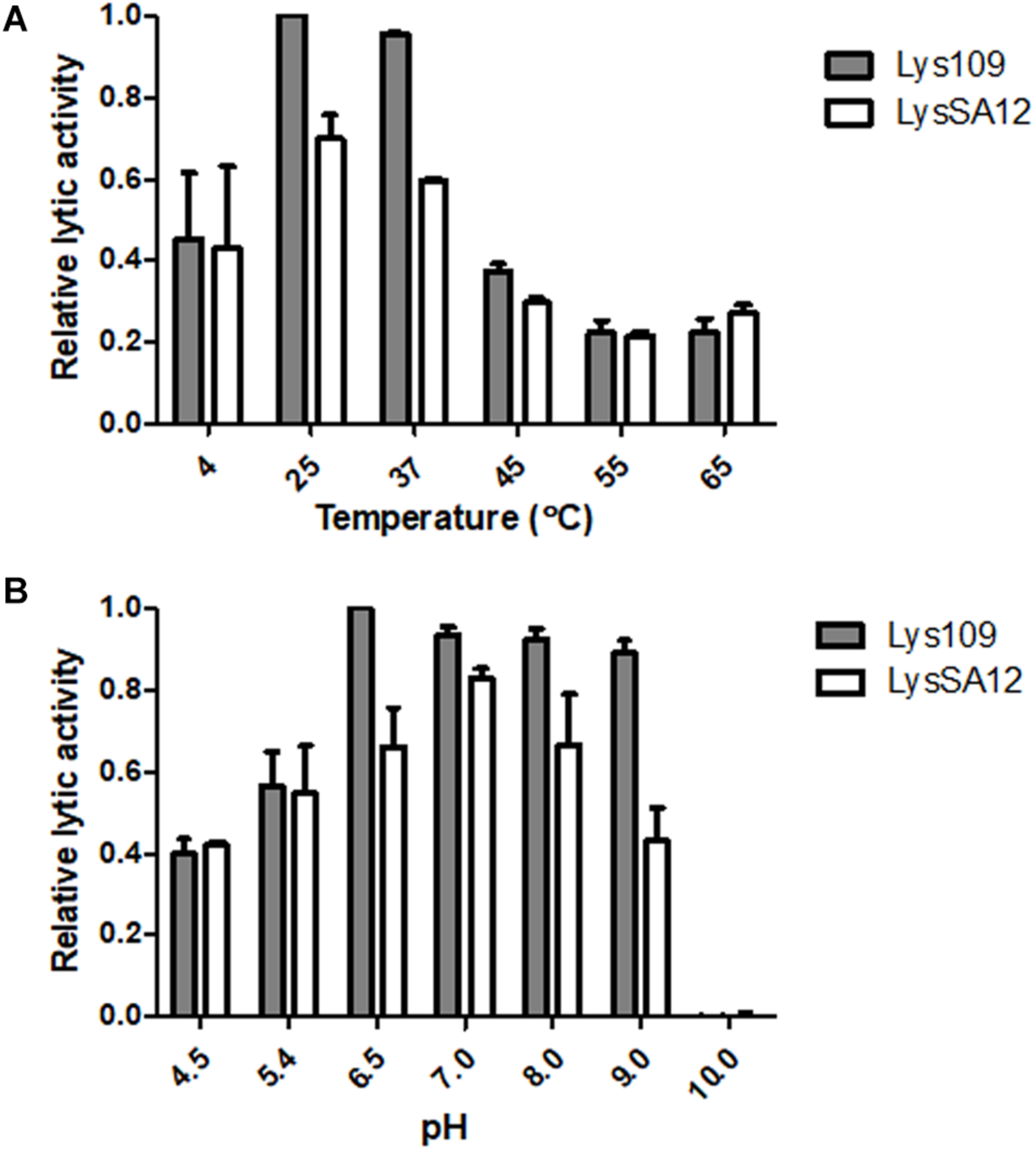 Figure 4. The effects of temperature and pH on the lytic activity of Lys109 and LysSA12. The optimum (A) temperature and (B) pH of Lys109 and LysSA12 were examined by incubation of the enzymes (300 nM each) with target cells at different temperatures and in different pH buffers, respectively. The relative lytic activities were calculated using the activity of Lys109 assayed in a buffer at pH 6.5 and 25°C, which showed maximal activity.