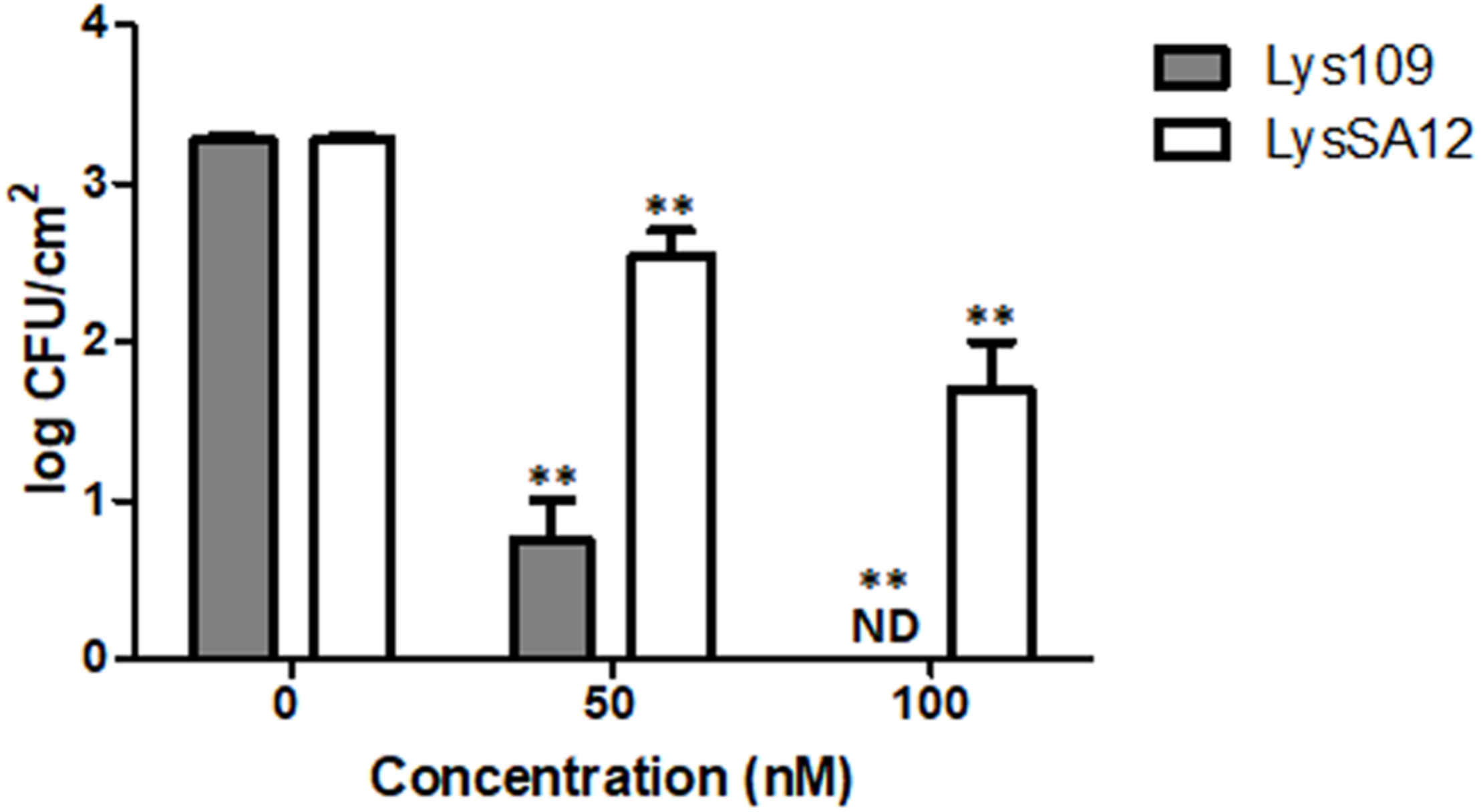 Figure 6. Antibacterial activity of Lys109 and LysSA12 against S. aureus CCARM 3090 on stainless steel. The number of S. aureus CCARM 3090 cells was counted after treatment with Lys109 and LysSA12 at concentrations of 0 nM (negative control), 50 and 100 nM. ND, not detected. Asterisks indicate significant differences (**P < 0.01).