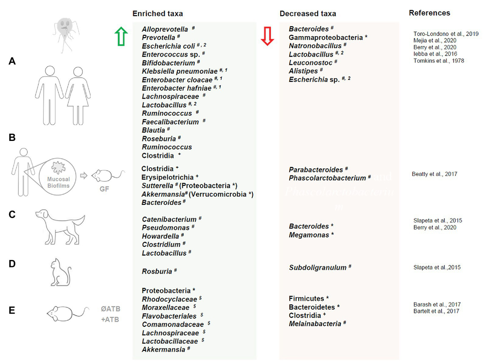 Dysbiosis in humans and animals upon Giardia duodenalis infection. Changes in gut microbiota taxa composition upon Giardia duodenalis infection in live hosts: (A) human, (B) gut microbiota biofilms isolated from human biopsies exposed to Giardia and administered to germ free mice, (C) dogs, (D) cats, and (E) mouse. Enriched taxa are indicated by a green arrow. Decreased taxa are indicated by a red arrow. ATB = antibiotic treatment; * = phylum; + = class; $ = family # = genus; 1 = patients with severe malabsorption; 2 = taxa both enriched and decreased in separate studies. Microbiota dysbiosis in response to Giardia muris infections (i.e., Yordanova et al., 2019) is not represented in this figure.